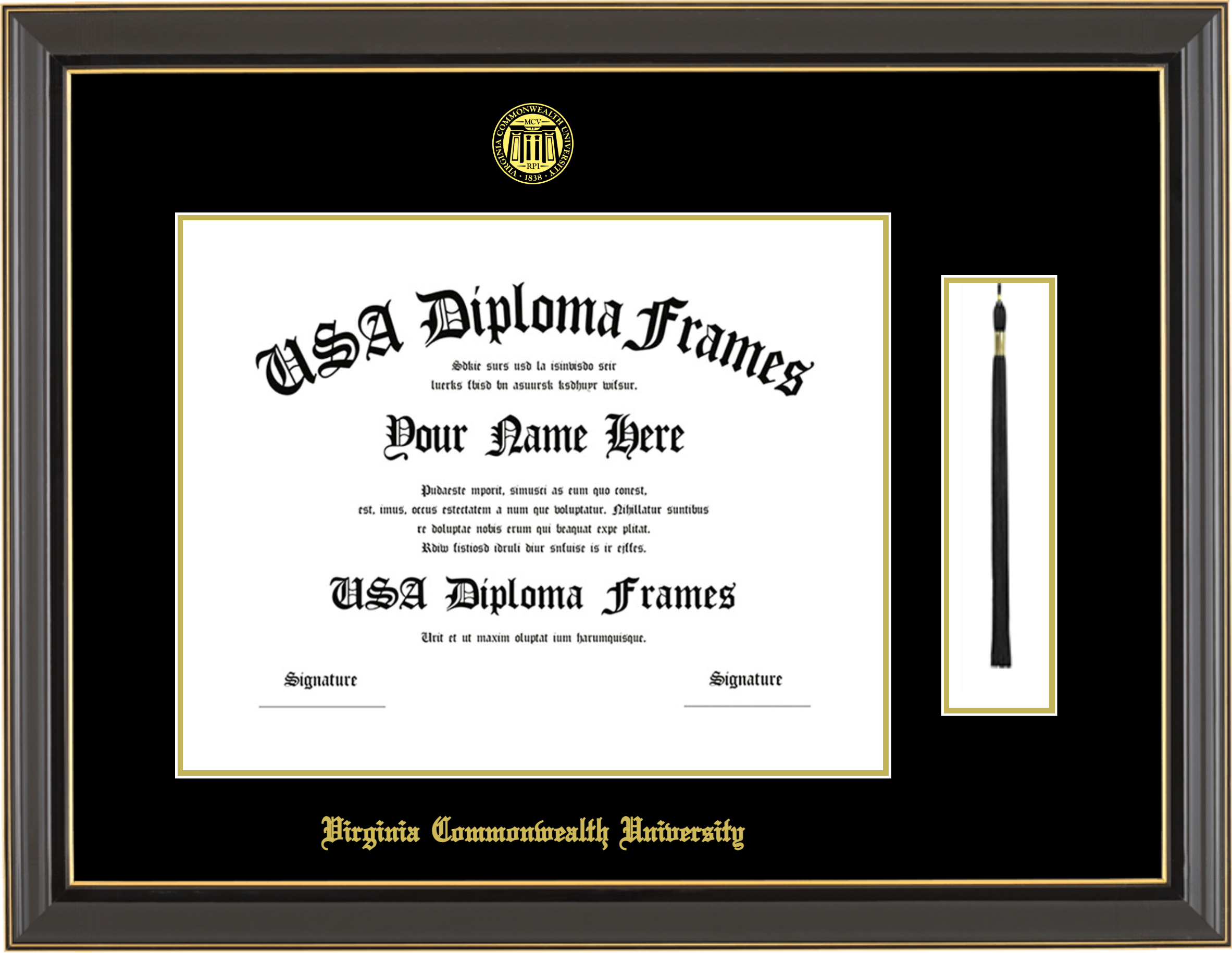 Virginia Commonwealth University Diploma Frame with Tassel – VCU – Black Gold Trim Glossy – Black and Gold Mat