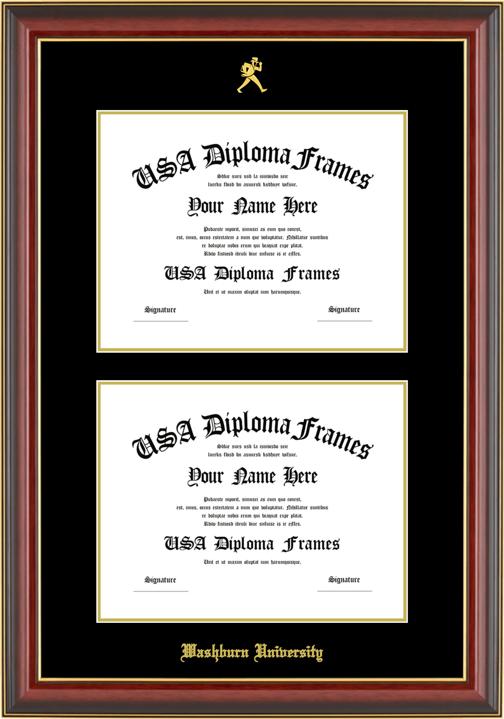 Washburn University Double Diploma Frame – Double Document – Cherry Mahogany Gold Trim Glossy – Black and Gold Mat