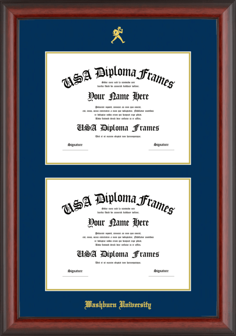 Washburn University Double Diploma Frame – Double Document – Cherry Mahogany Matte – Navy and Gold Mat