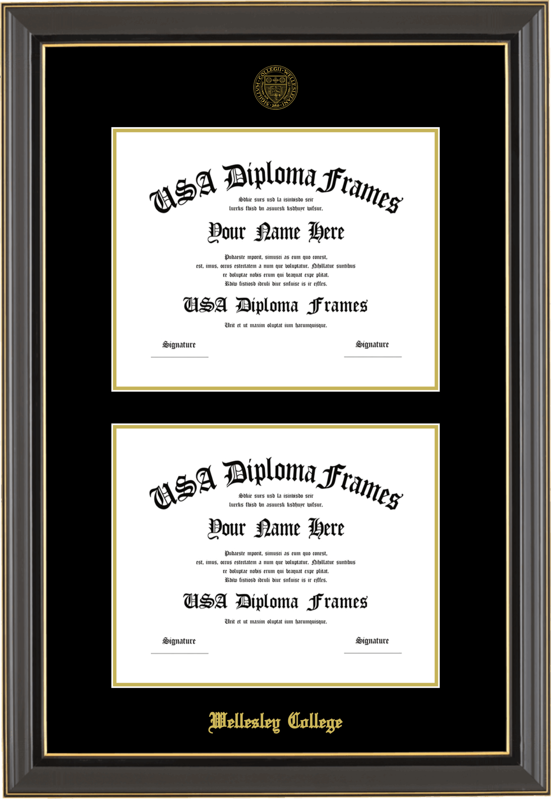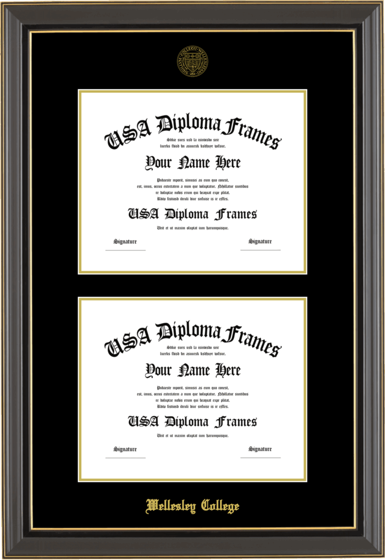 Wellesley College Double Diploma Frame – Double Document – Black Gold Trim Glossy – Black and Gold Mat