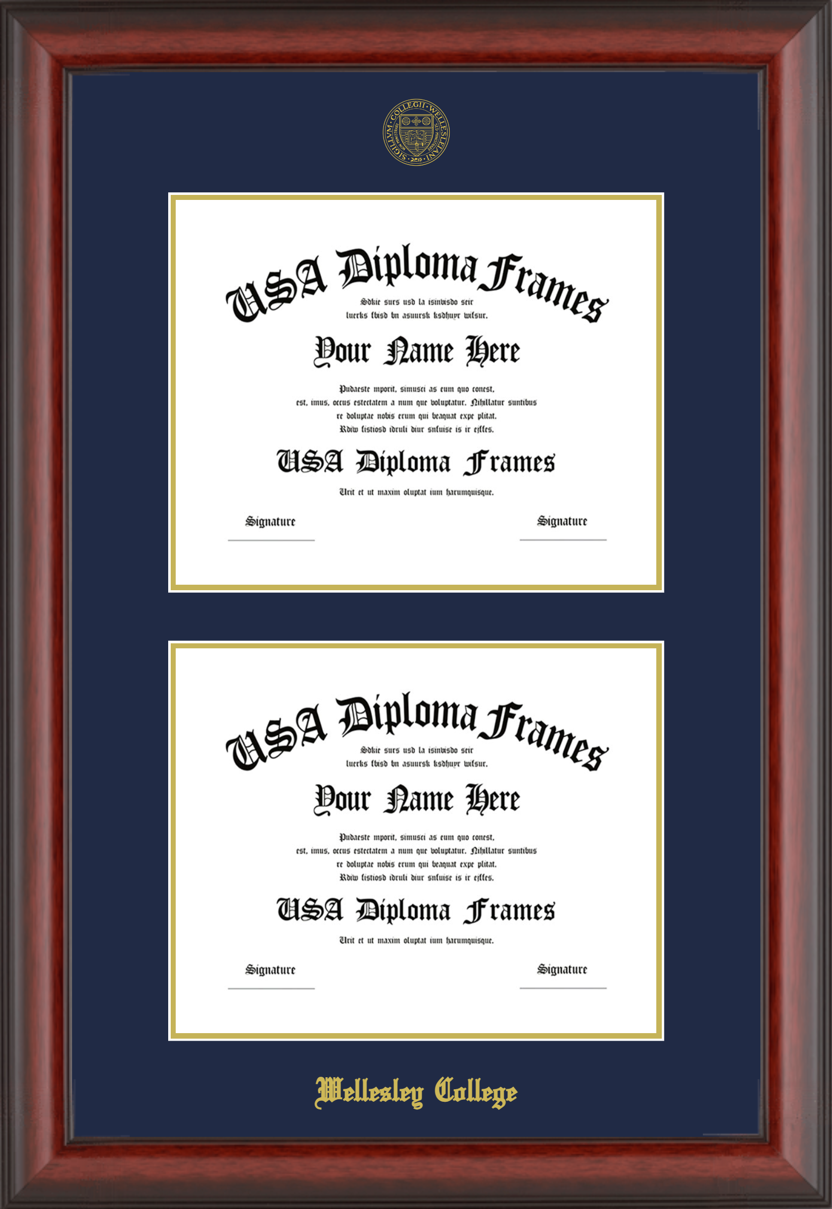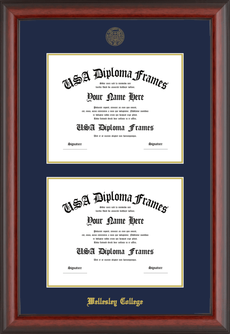 Wellesley College Double Diploma Frame – Double Document – Cherry Mahogany Matte – Navy and Gold Mat