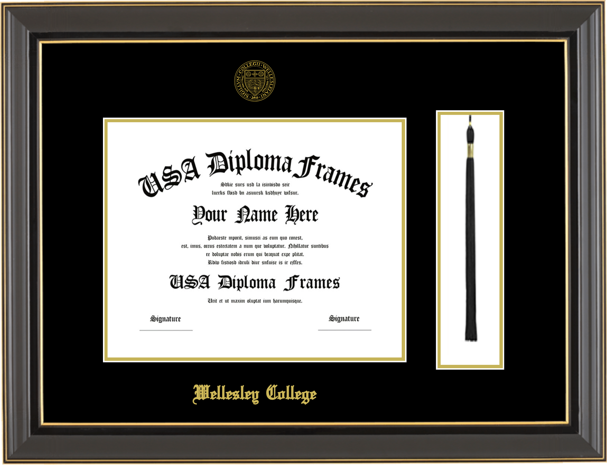 Wellesley College – Single Horizontal Document ( Diploma ) – Black Gold Trim Glossy – Black Mat – Gold Accent Mat – With Tassel(Default) – With Seal(University Seal Gold) – With Gold Embossing (Wellesley College)