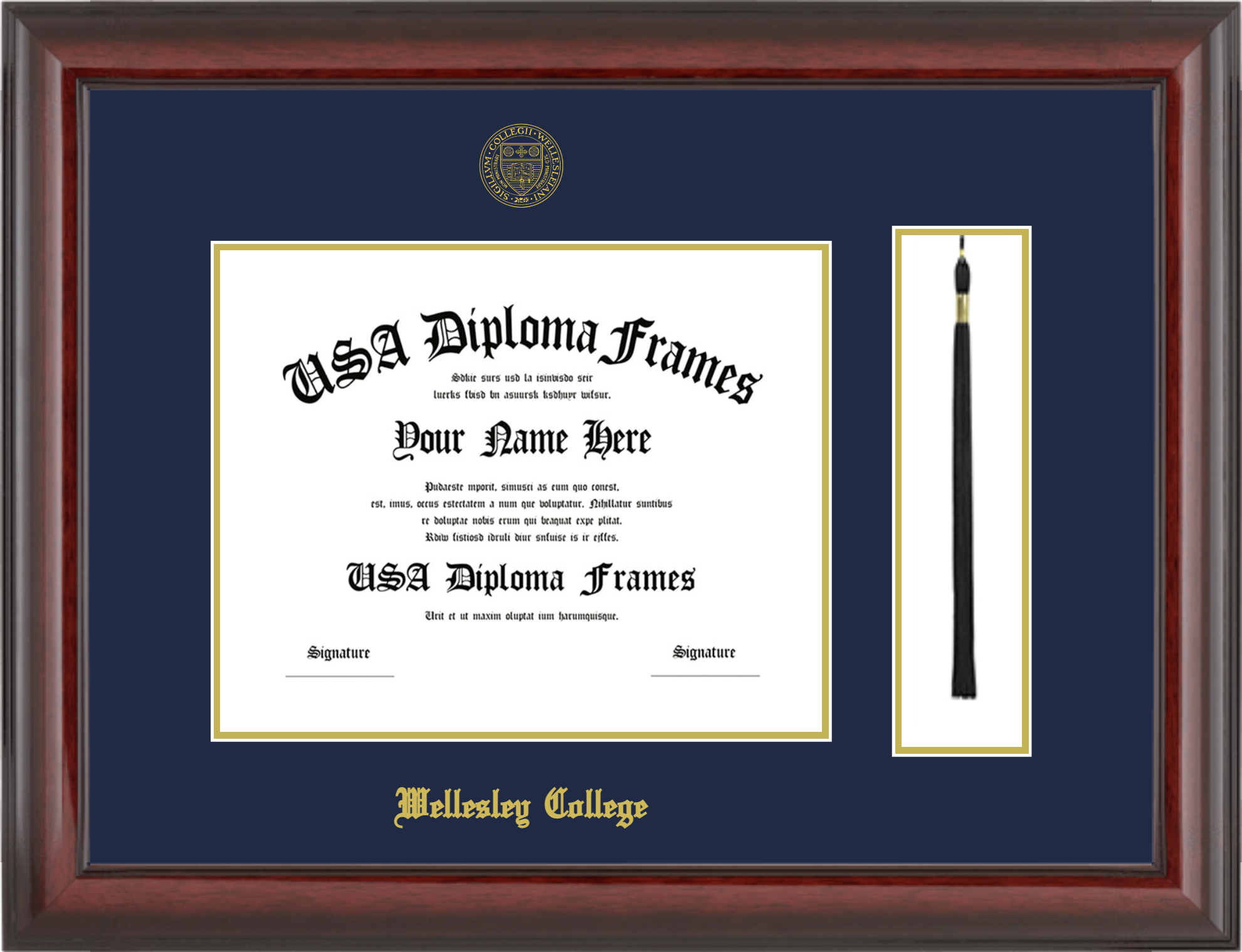 Wellesley College – Single Horizontal Document ( Diploma ) – Cherry Mahogany Glossy – Navy Mat – Gold Accent Mat – With Tassel(Default) – With Seal(University Seal Gold) – With Gold Embossing (Wellesley College)