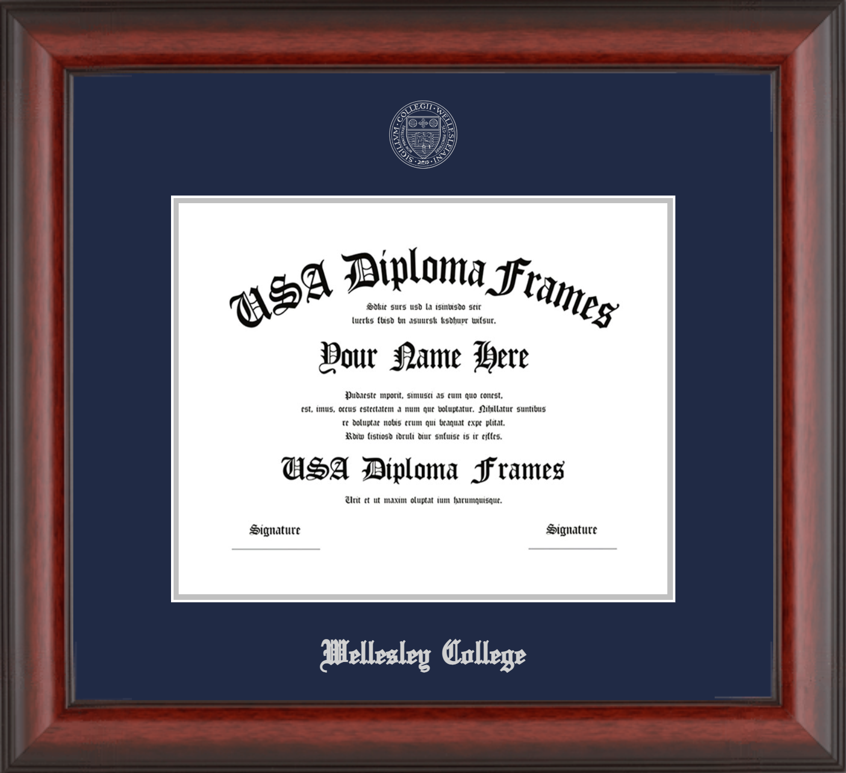 Wellesley College – Single Horizontal Document ( Diploma ) – Cherry Mahogany Matte – Navy Mat – Silver Accent Mat – With Seal(University Seal Silver) – With Silver Embossing (Wellesley College)