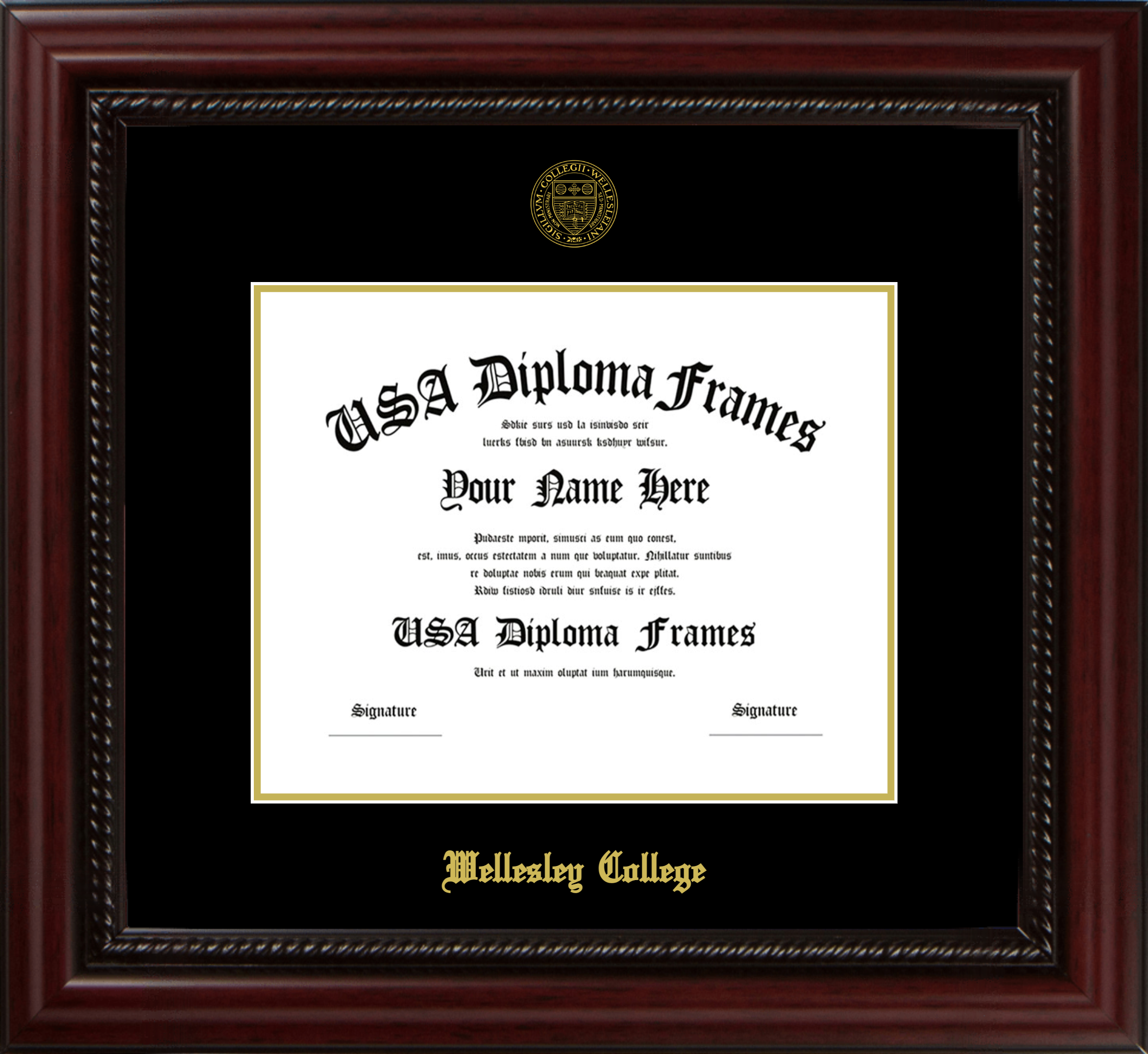 Wellesley College Diploma Frame – Executive Cherry Rope – Black and Gold Mat