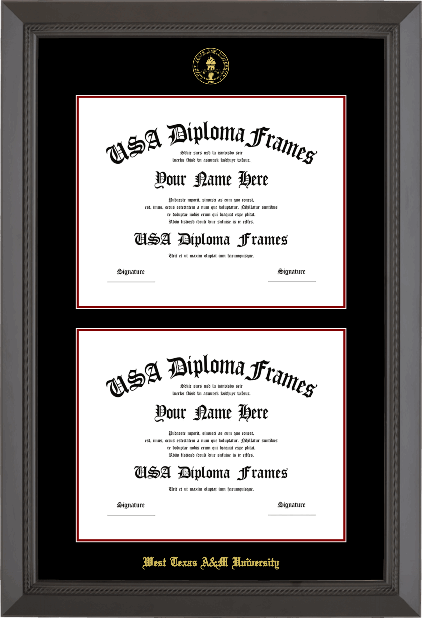West Texas A&M University Double Diploma Frame – Double Document – Black Rope – Black and Maroon Mat