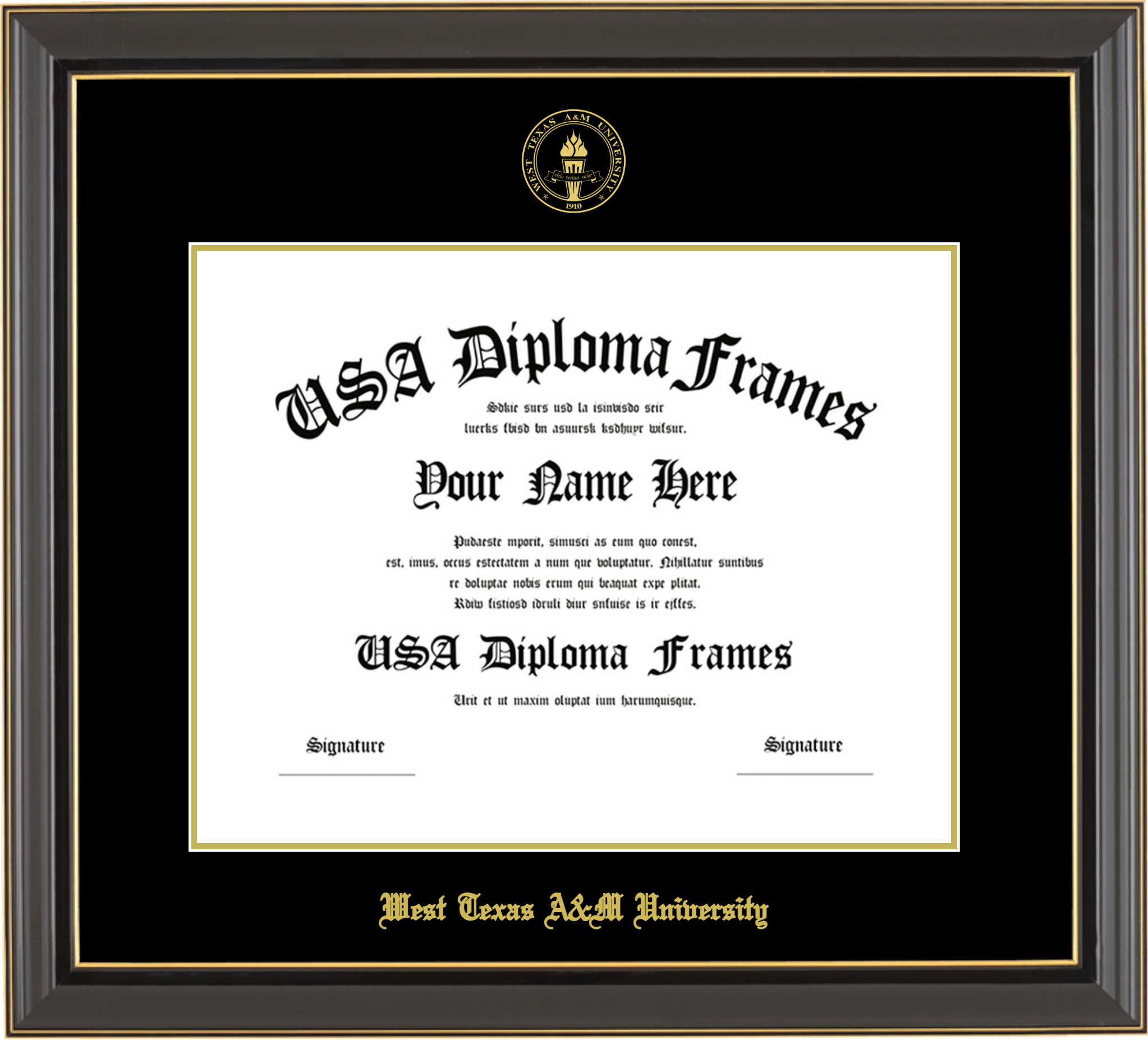 West Texas A&M University Diploma Frame – Black Gold Trim Glossy – Black and Gold Mat