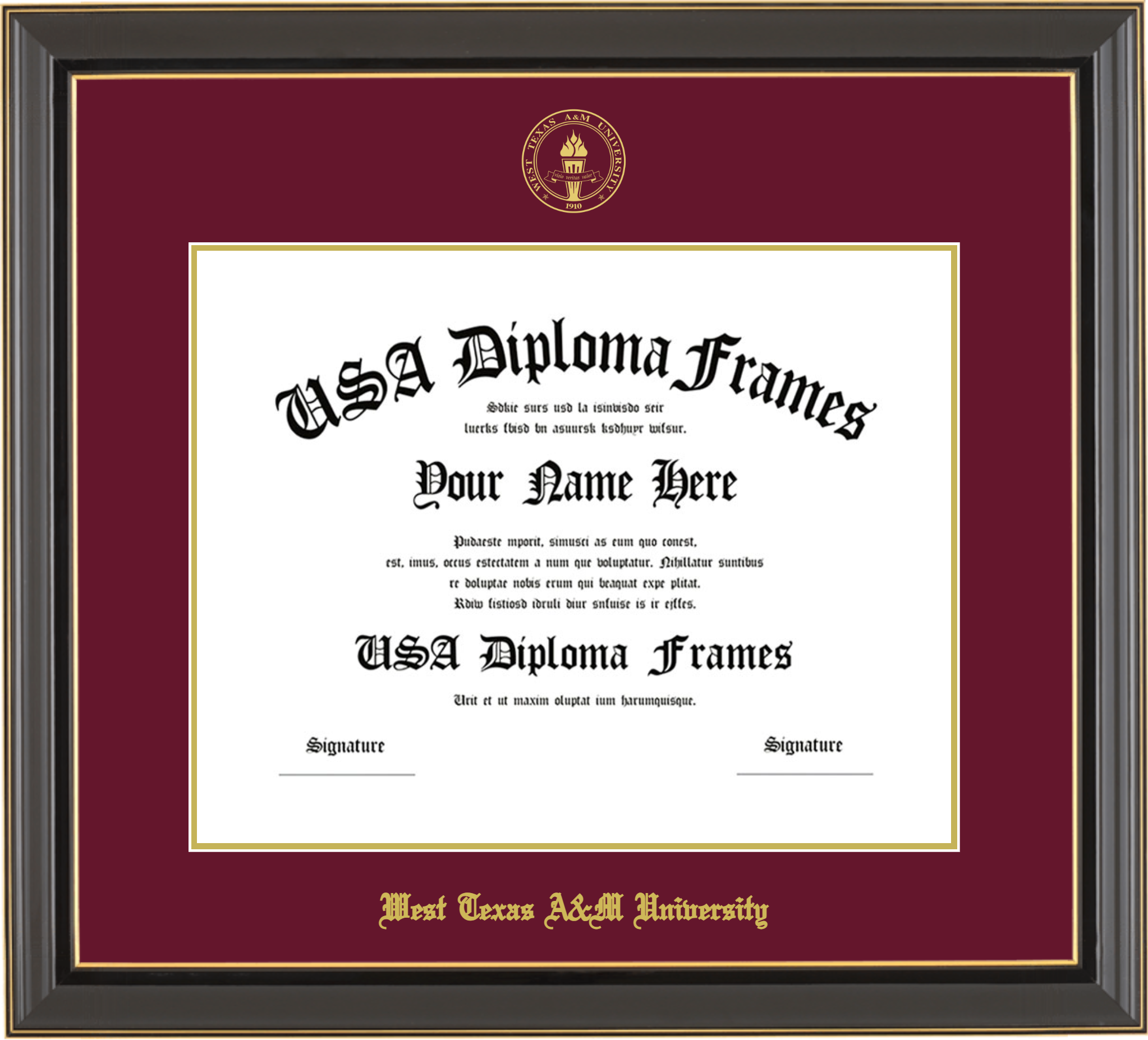 West Texas A&M University – Single Horizontal Document ( Diploma ) – Black Gold Trim Glossy – Maroon Mat – Gold Accent Mat – With Seal(University Seal Gold) – With Gold Embossing (West Texas A&M University)