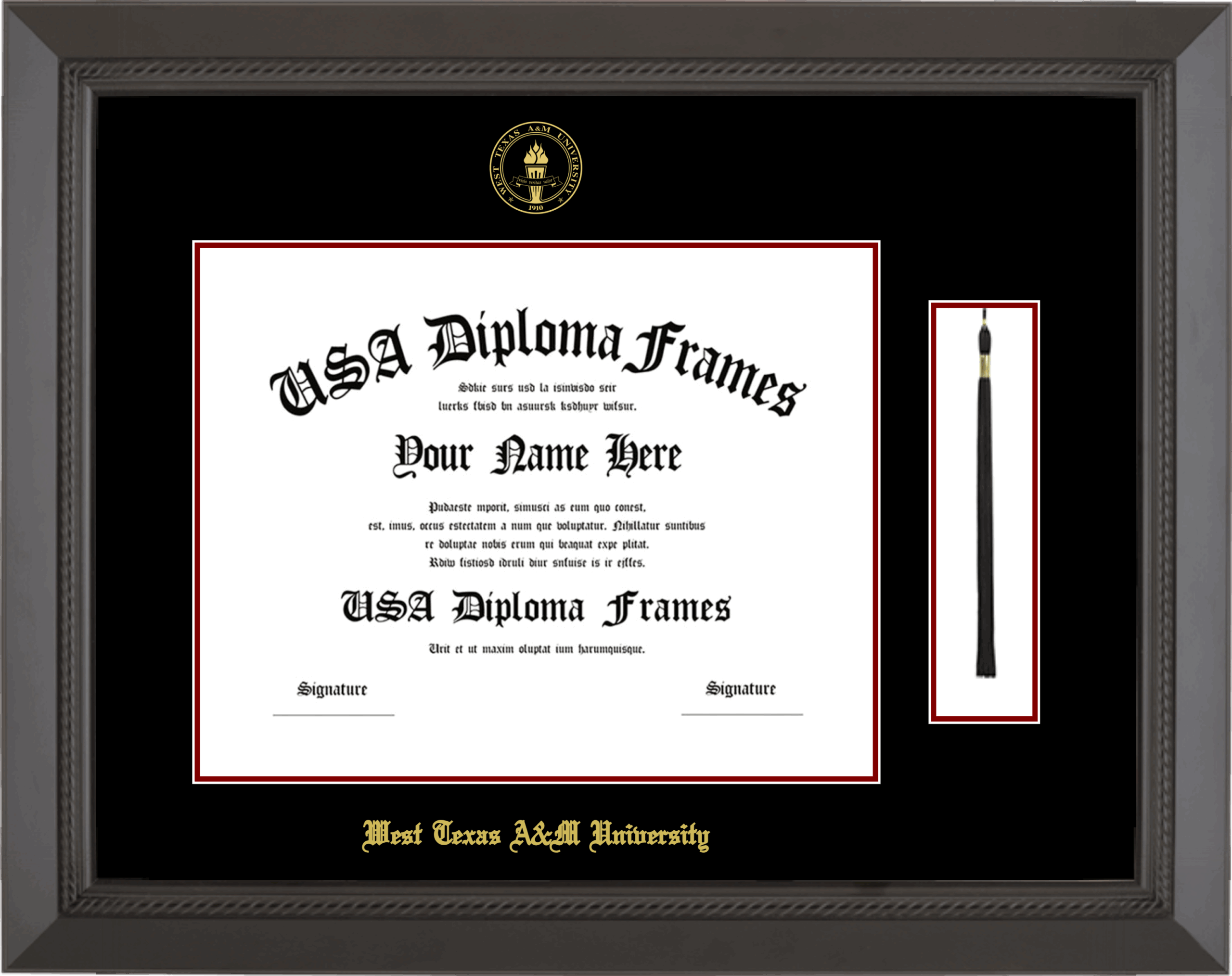 West Texas A&M University Diploma Frame with Tassel – Black Rope – Black and Maroon Mat