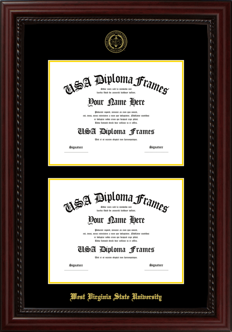 West Virginia State University Double Diploma Frame – Double Document – Executive Cherry Rope – Black and Yellow Gold Mat