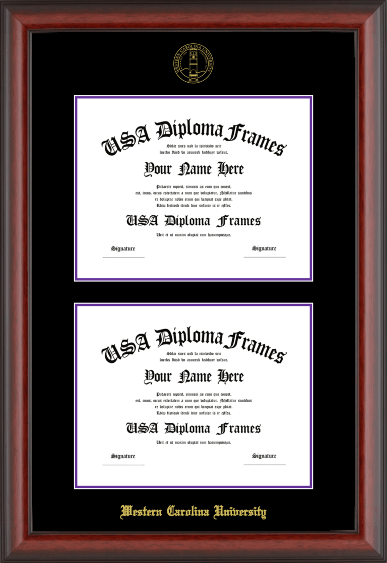 Western Carolina University Double Diploma Frame – Double Document – Cherry Mahogany Matte – Black and Purple Mat
