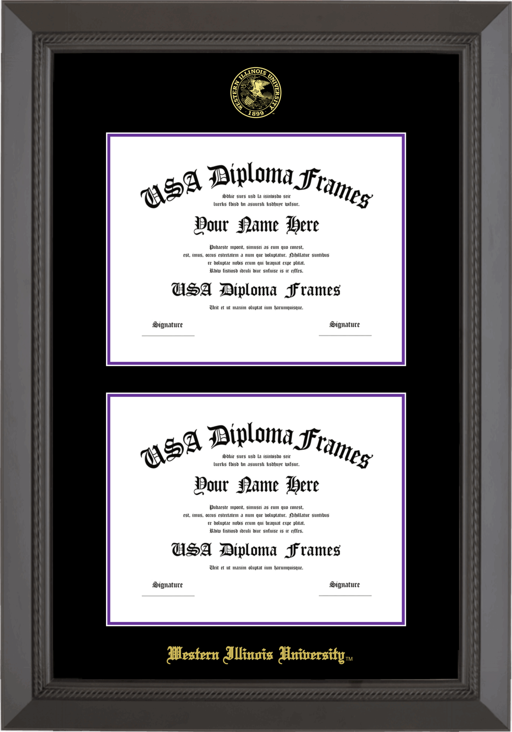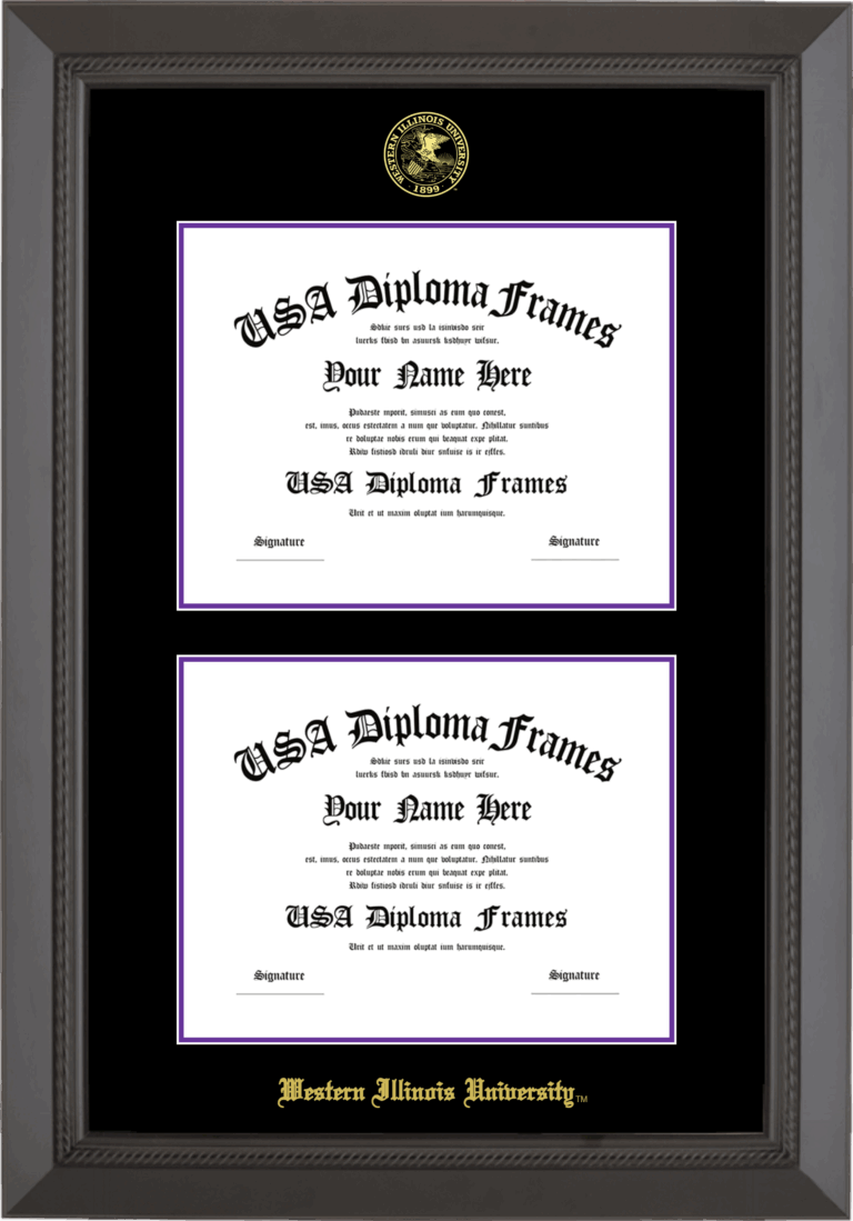 Western Illinois University Double Diploma Frame – Double Document – Black Rope – Black and Purple Mat