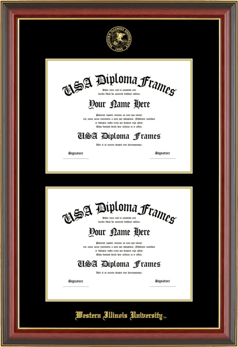 Western Illinois University Double Diploma Frame – Double Document – Cherry Mahogany Gold Trim Glossy – Black and Gold Mat
