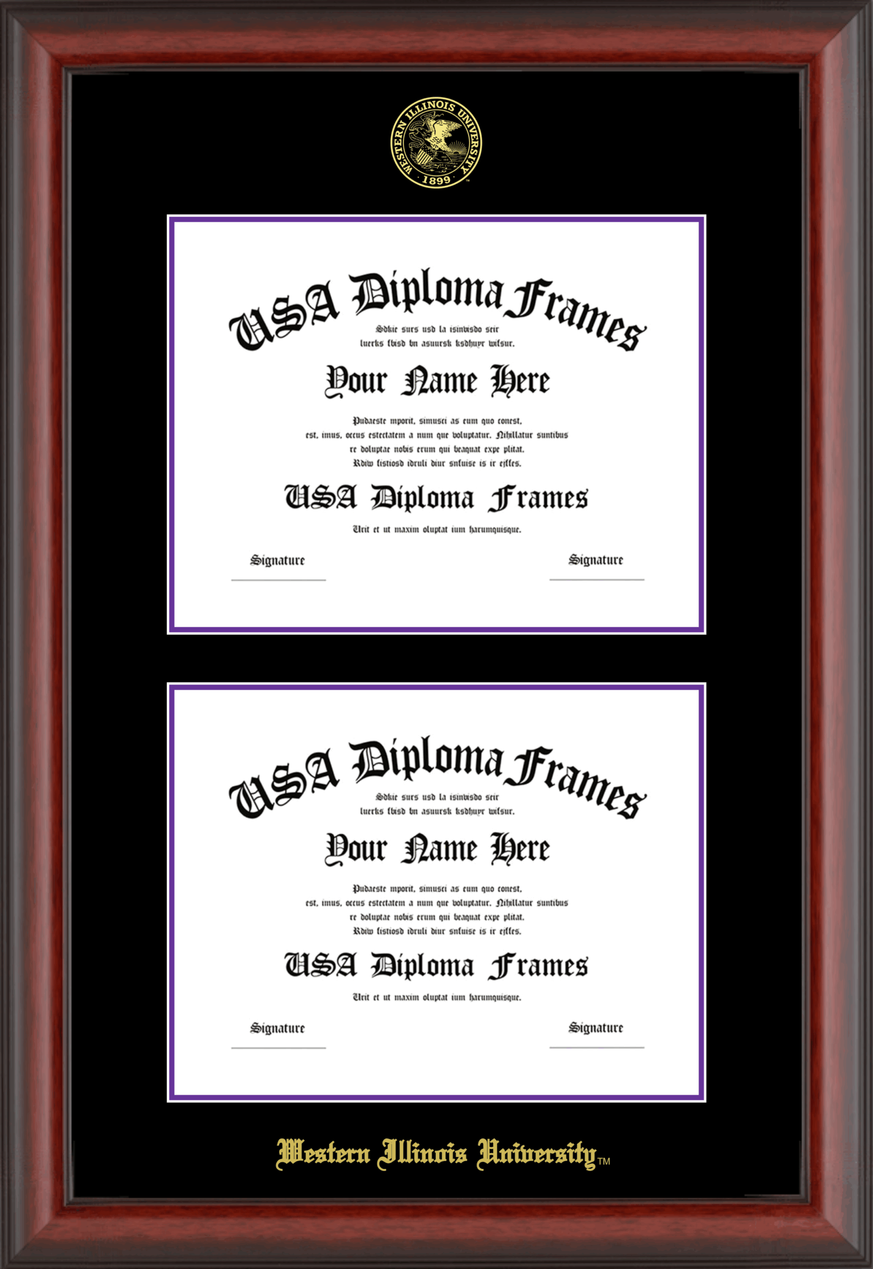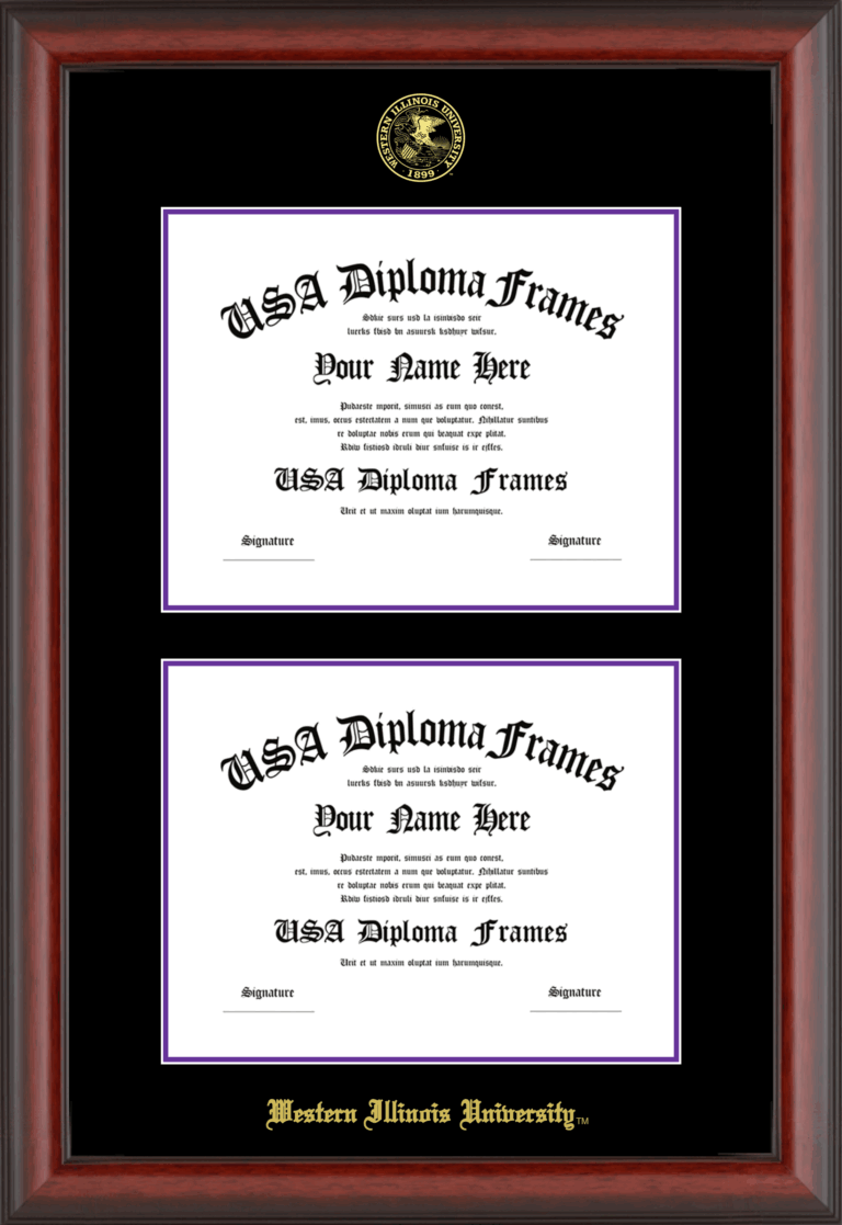 Western Illinois University Double Diploma Frame – Double Document – Cherry Mahogany Matte – Black and Purple Mat