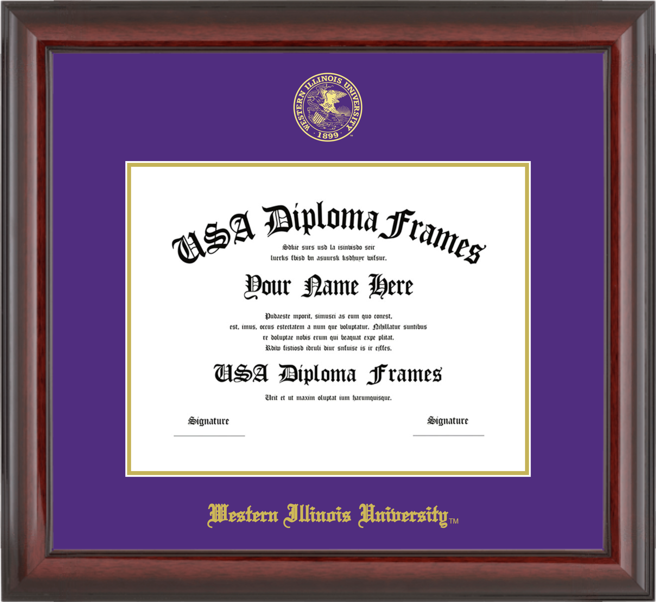 Western Illinois University – Single Horizontal Document ( Diploma ) – Cherry Mahogany Glossy – Purple Mat – Gold Accent Mat – With Seal(University Seal Gold) – With Gold Embossing (Western Illinois University)