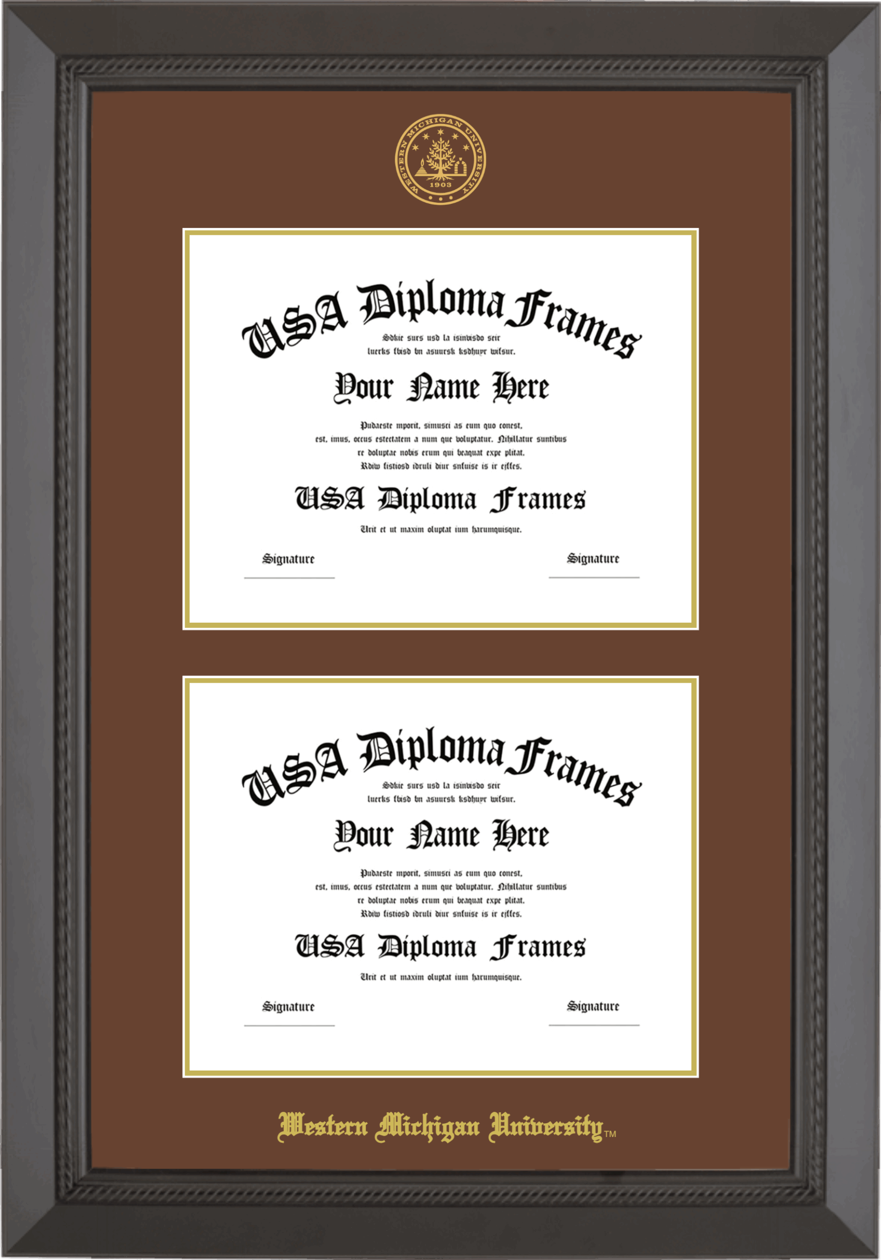 Western Michigan University Double Diploma Frame – Double Document – Black Rope – Brown and Gold Mat