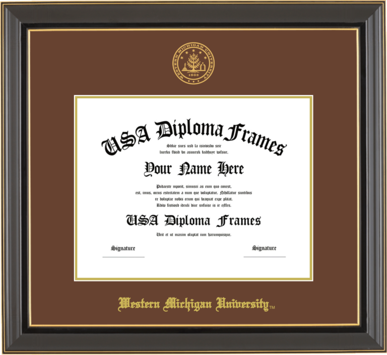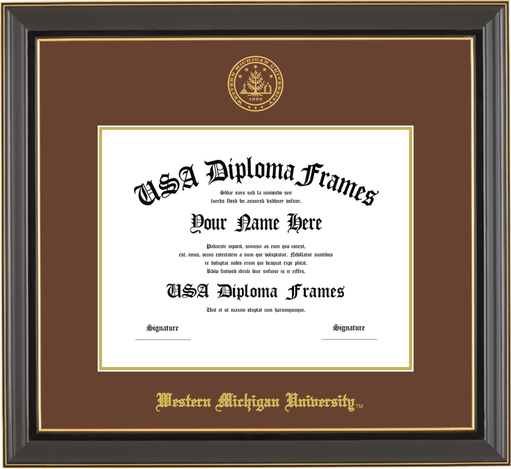 Western Michigan University – Single Horizontal Document ( Diploma ) – Black Gold Trim Glossy – Brown Mat – Gold Accent Mat – With Seal(University Seal Gold) – With Gold Embossing (Western Michigan University)