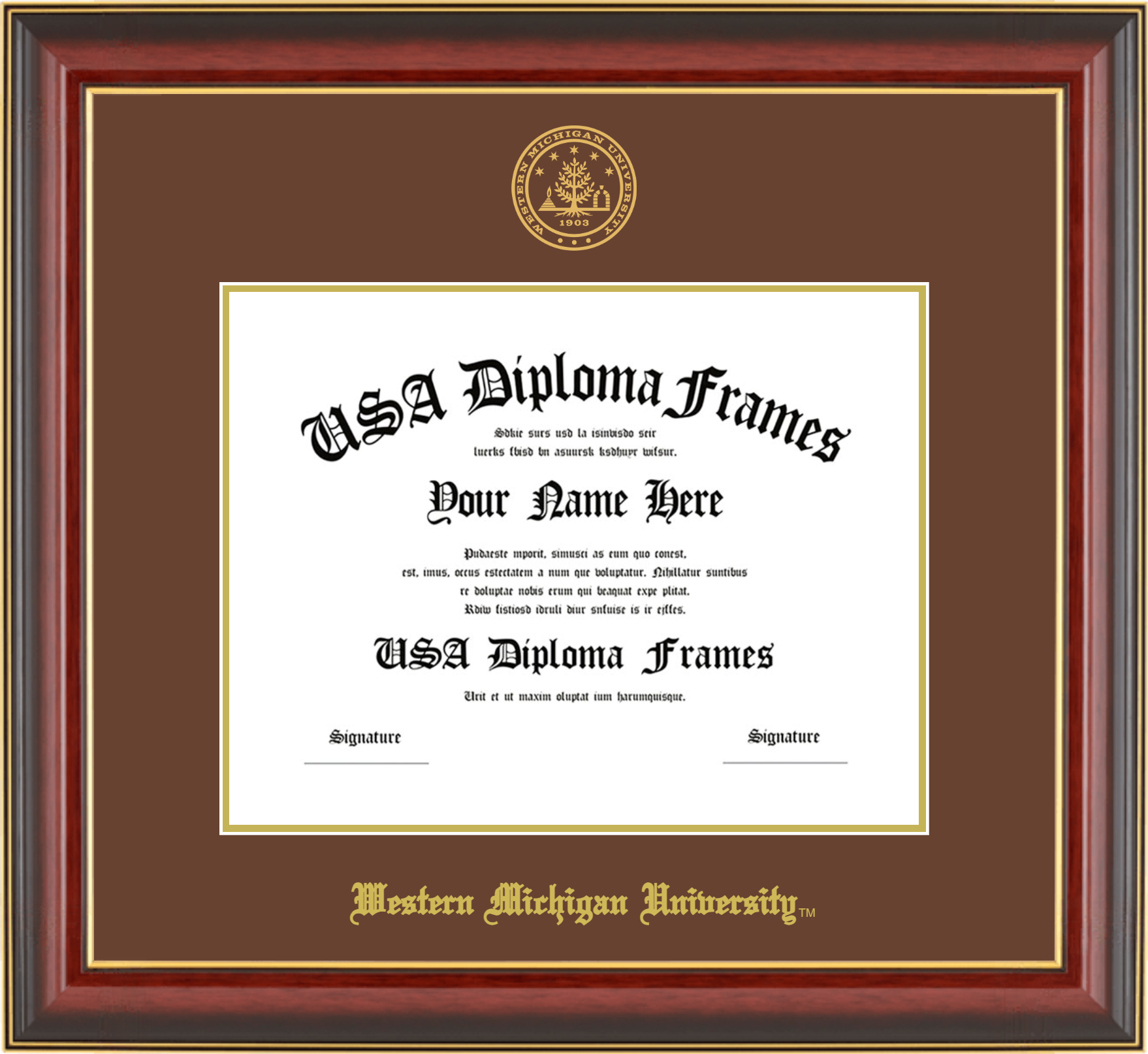 Western Michigan University Diploma Frame – Cherry Mahogany Gold Trim Glossy – Brown and Gold Mat