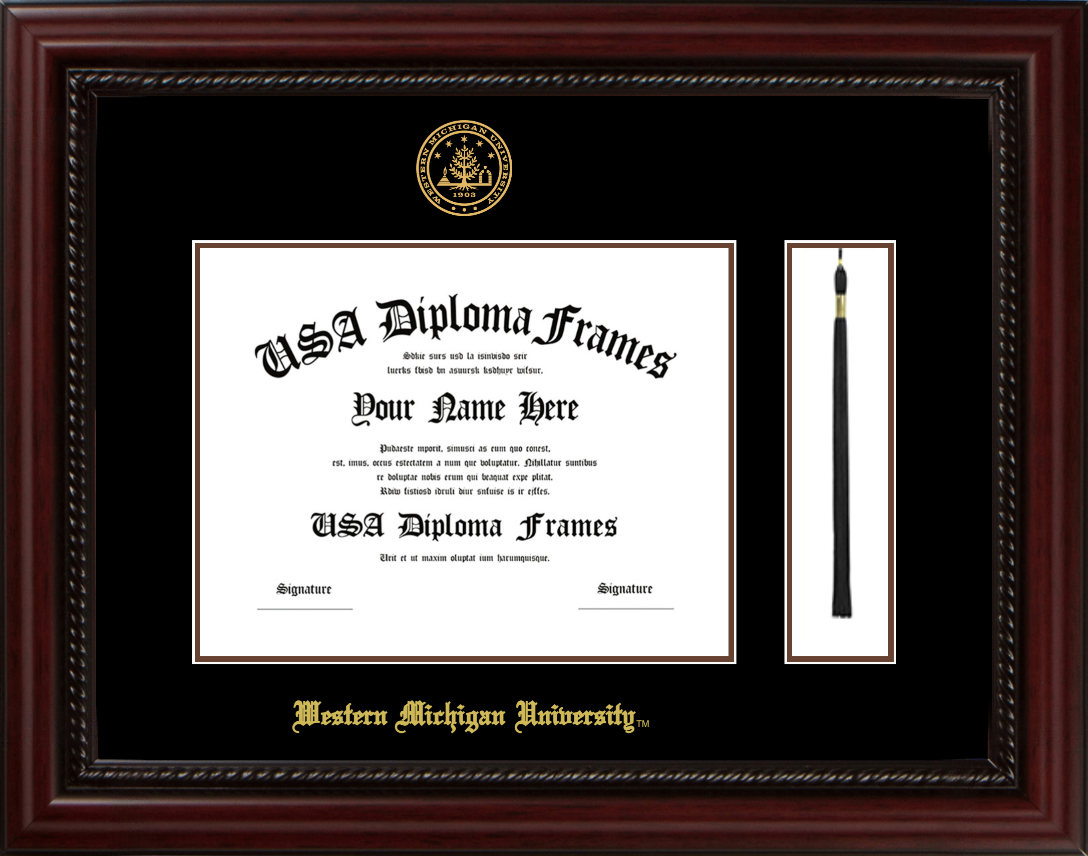 Western Michigan University Diploma Frame with Tassel – Executive Cherry Rope – Black and Brown Mat