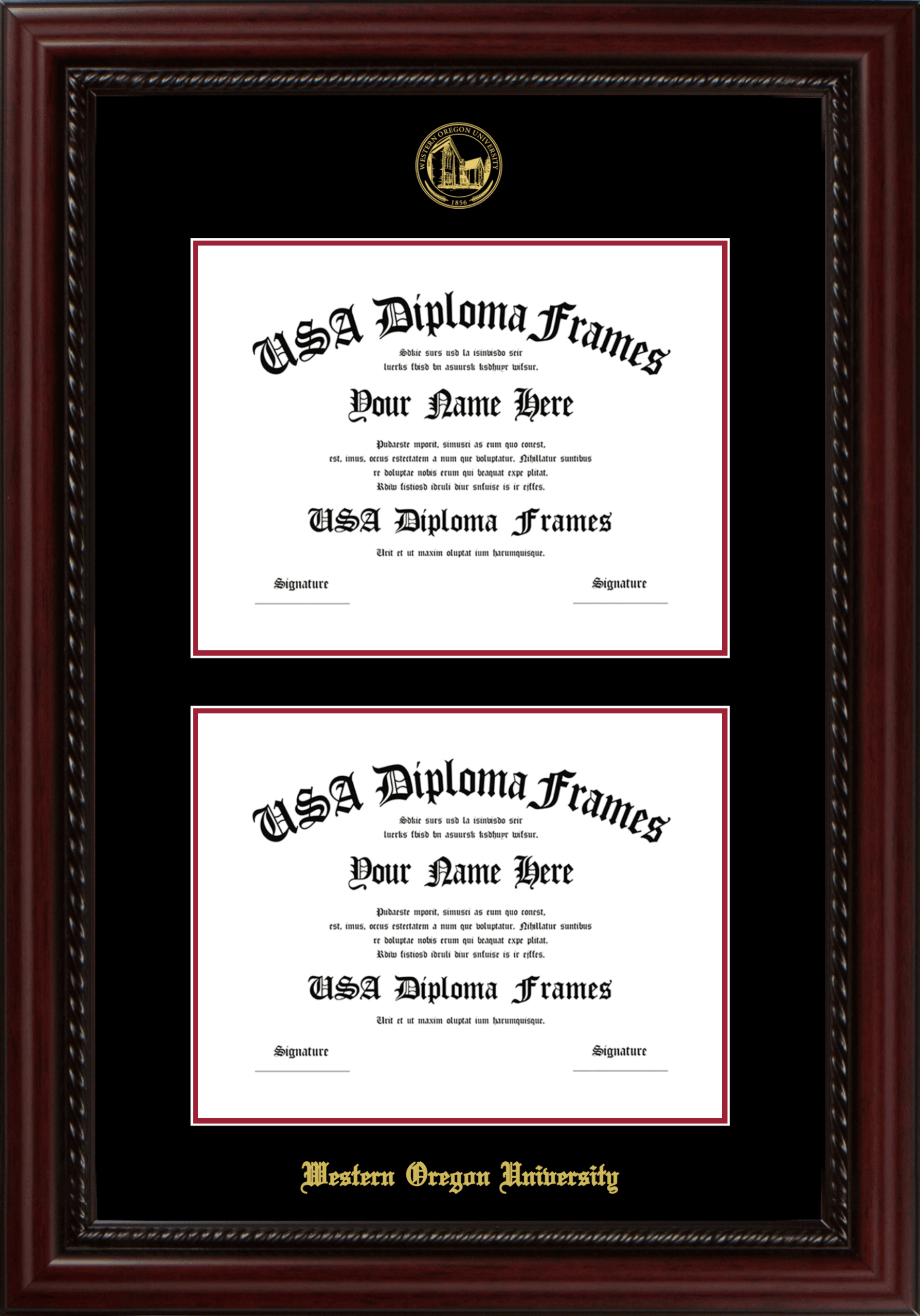 Western Oregon University Double Diploma Frame – Double Document – Executive Cherry Rope – Black and Crimson Mat