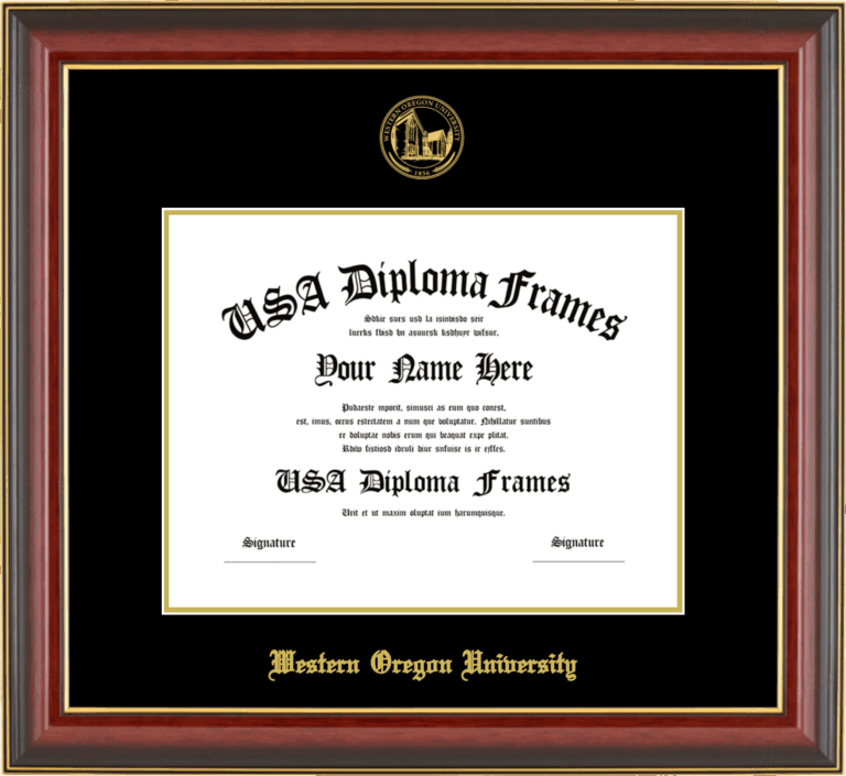 Western Oregon University Diploma Frame – Cherry Mahogany Gold Trim Glossy – Black and Gold Mat