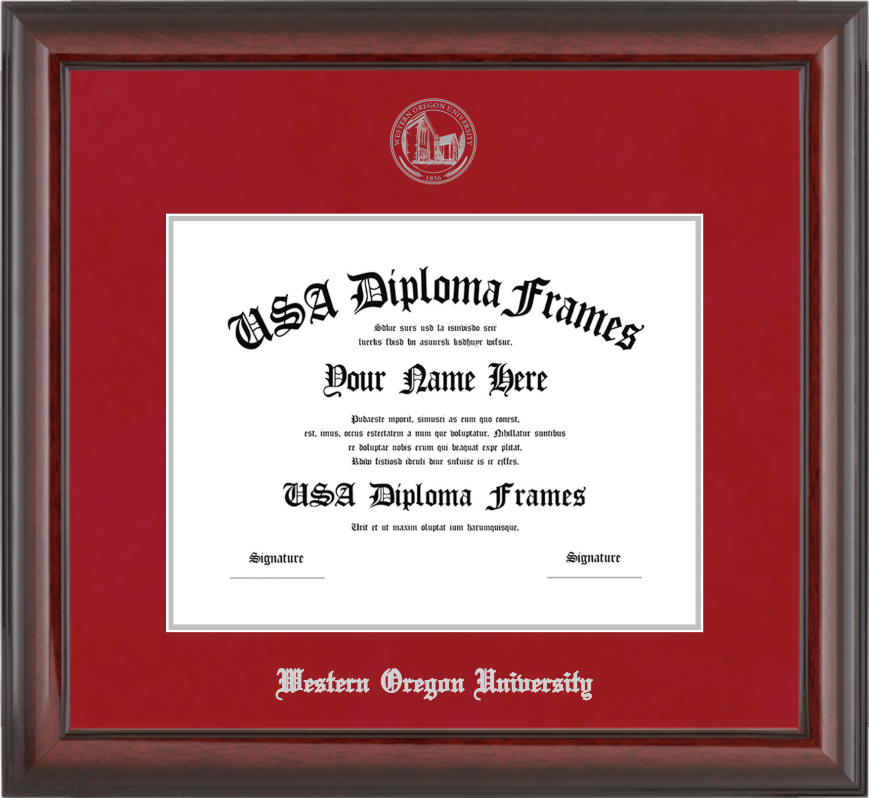 Western Oregon University – Single Horizontal Document ( Diploma ) – Cherry Mahogany Glossy – Crimson Mat – Silver Accent Mat – With Seal(University Seal Silver) – With Silver Embossing (Western Oregon University)