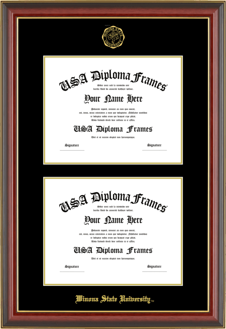 Winona State University Double Diploma Frame – Double Document – Cherry Mahogany Gold Trim Glossy – Black and Gold Mat