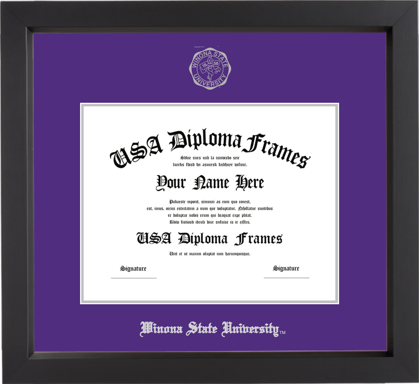 Winona State University – Single Horizontal Document ( Diploma ) – Black Matte – Purple Mat – Silver Accent Mat – With Seal(University Seal Silver) – With Silver Embossing (Winona State University)