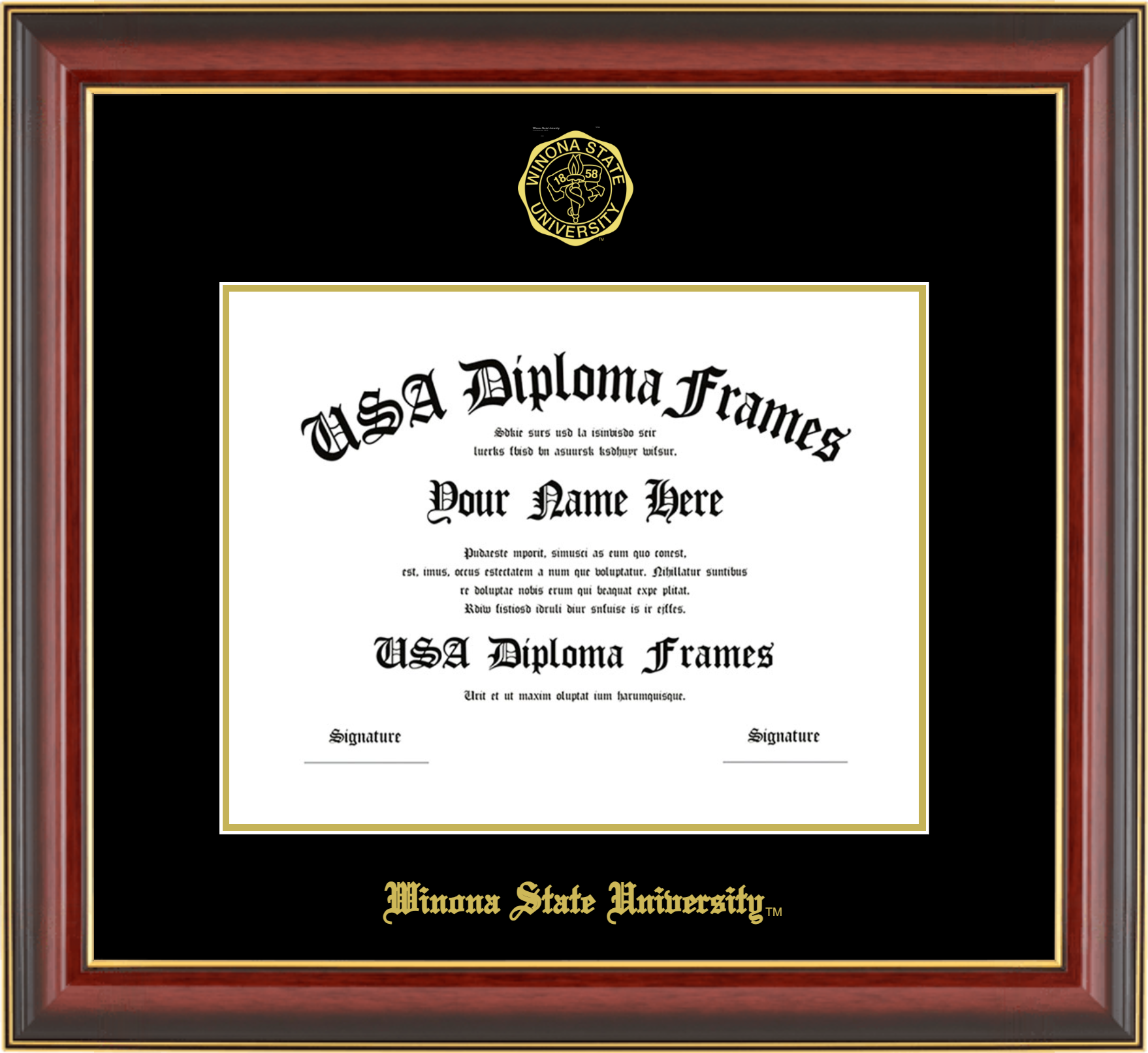 Winona State University – Single Horizontal Document ( Diploma ) – Cherry Mahogany Gold Trim Glossy – Black Mat – Gold Accent Mat – With Seal(University Seal Gold) – With Gold Embossing (Winona State University)