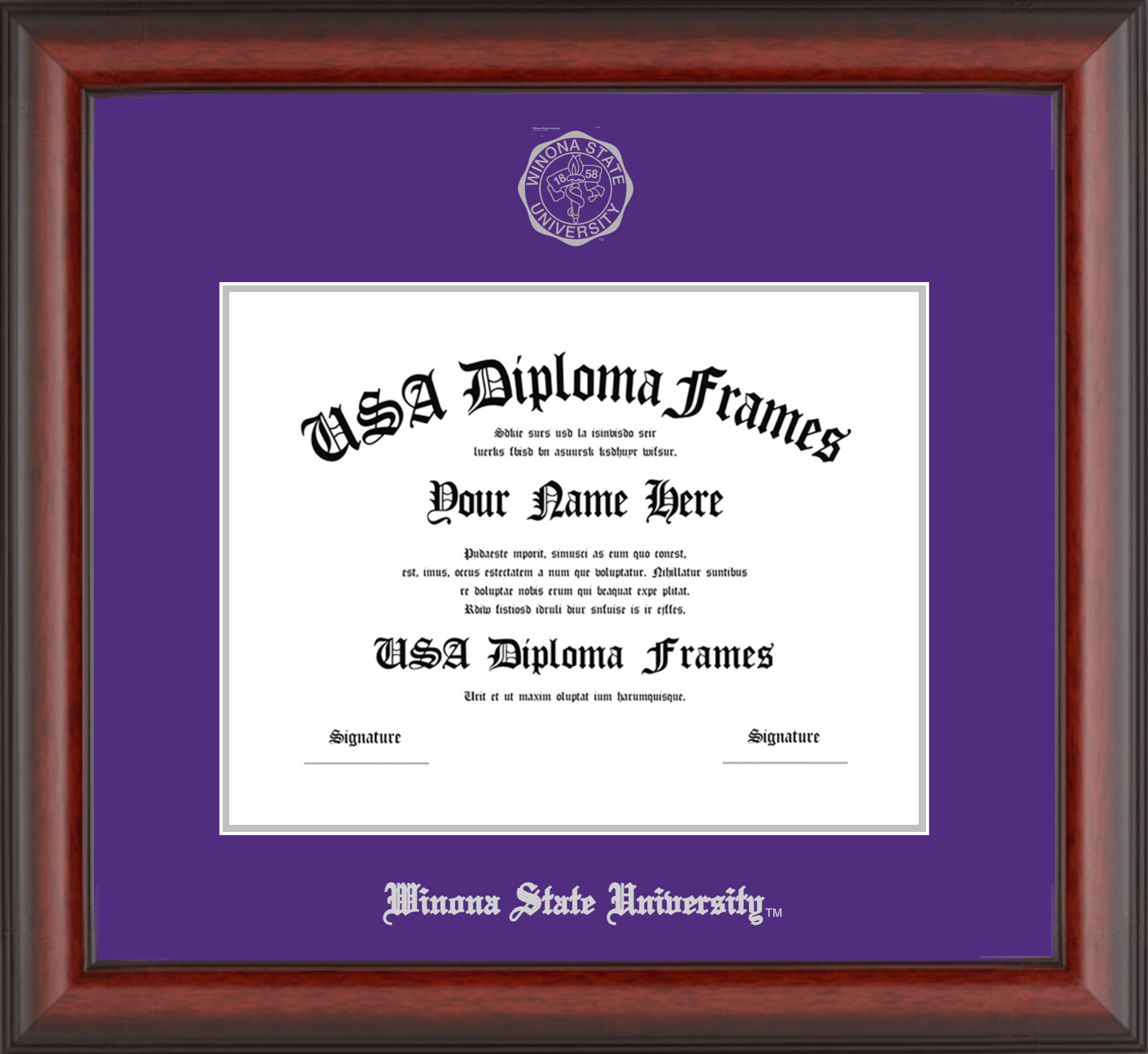 Winona State University – Single Horizontal Document ( Diploma ) – Cherry Mahogany Matte – Purple Mat – Silver Accent Mat – With Seal(University Seal Silver) – With Silver Embossing (Winona State University)