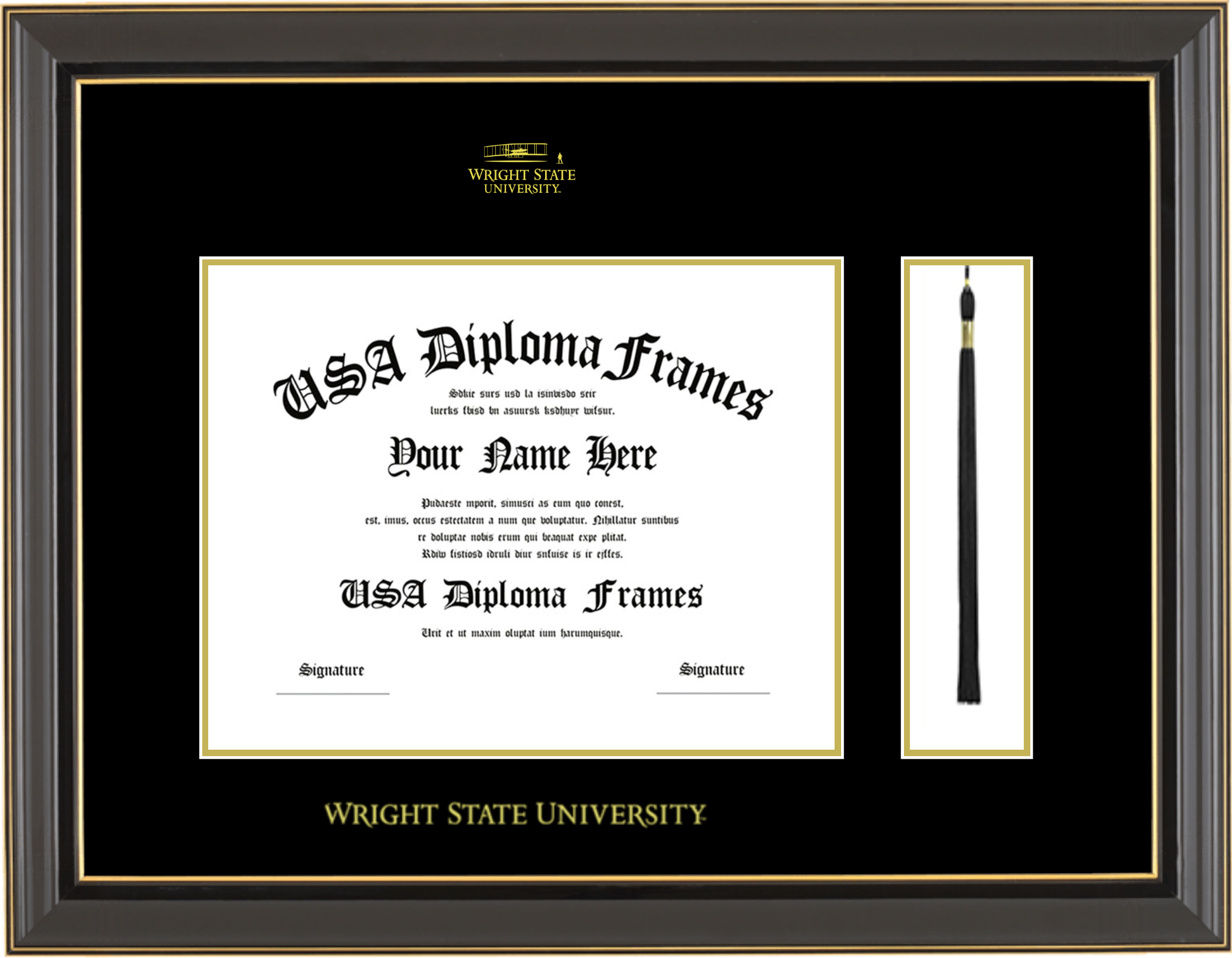 Wright State University Diploma Frame with Tassel – Black Gold Trim Glossy – Black and Gold Mat