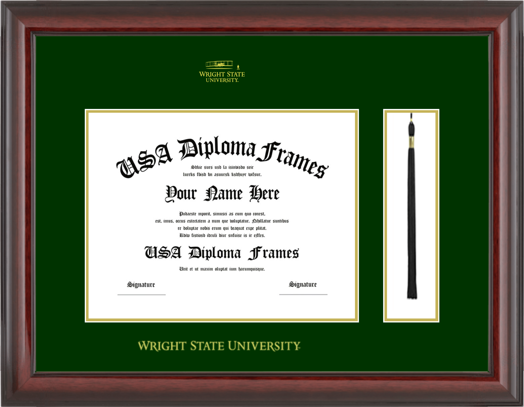 Wright State University Diploma Frame with Tassel – Cherry Mahogany Glossy – Winter Green and Gold Mat