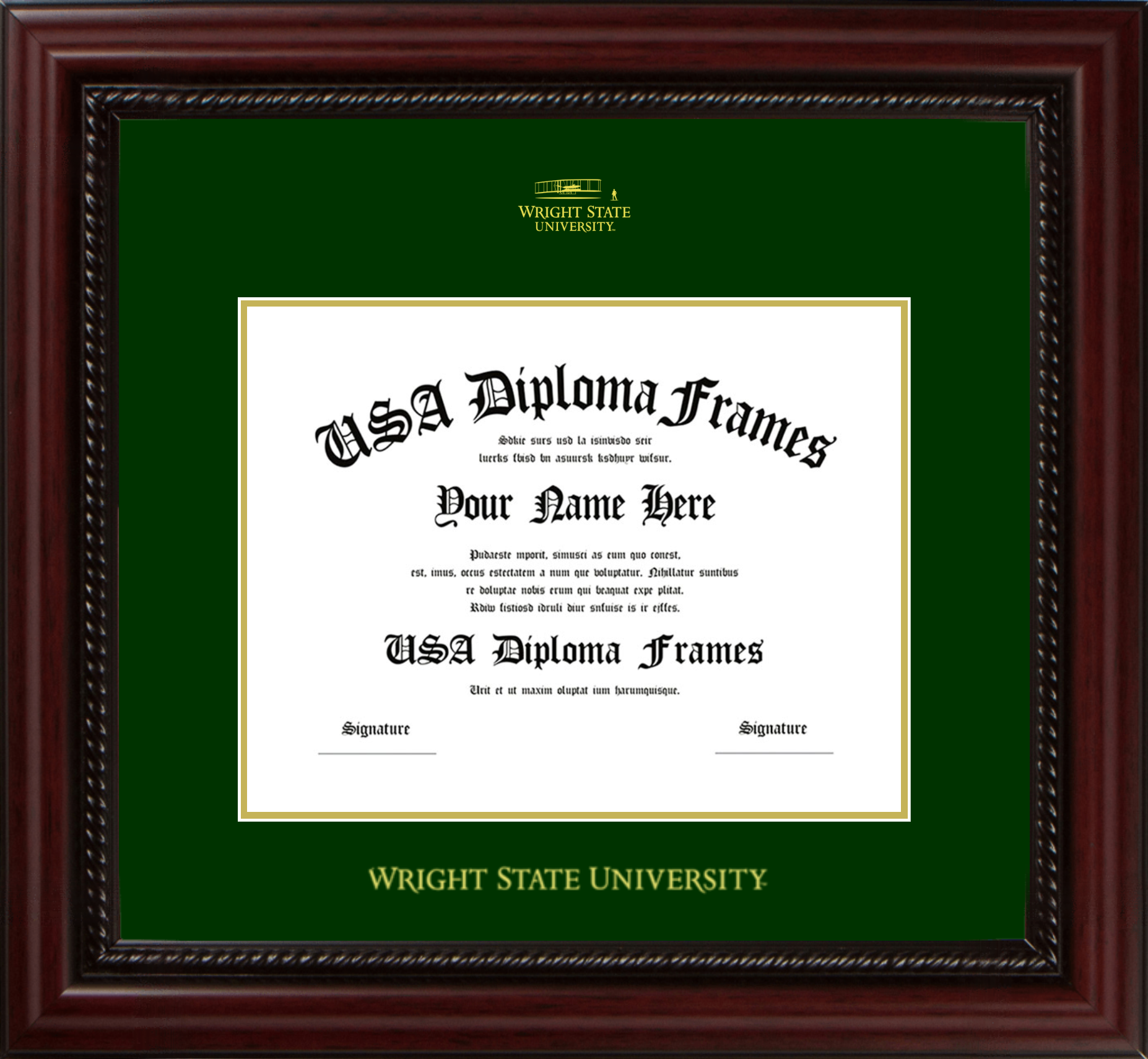Wright State University Diploma Frame – Executive Cherry Rope – Winter Green and Gold Mat