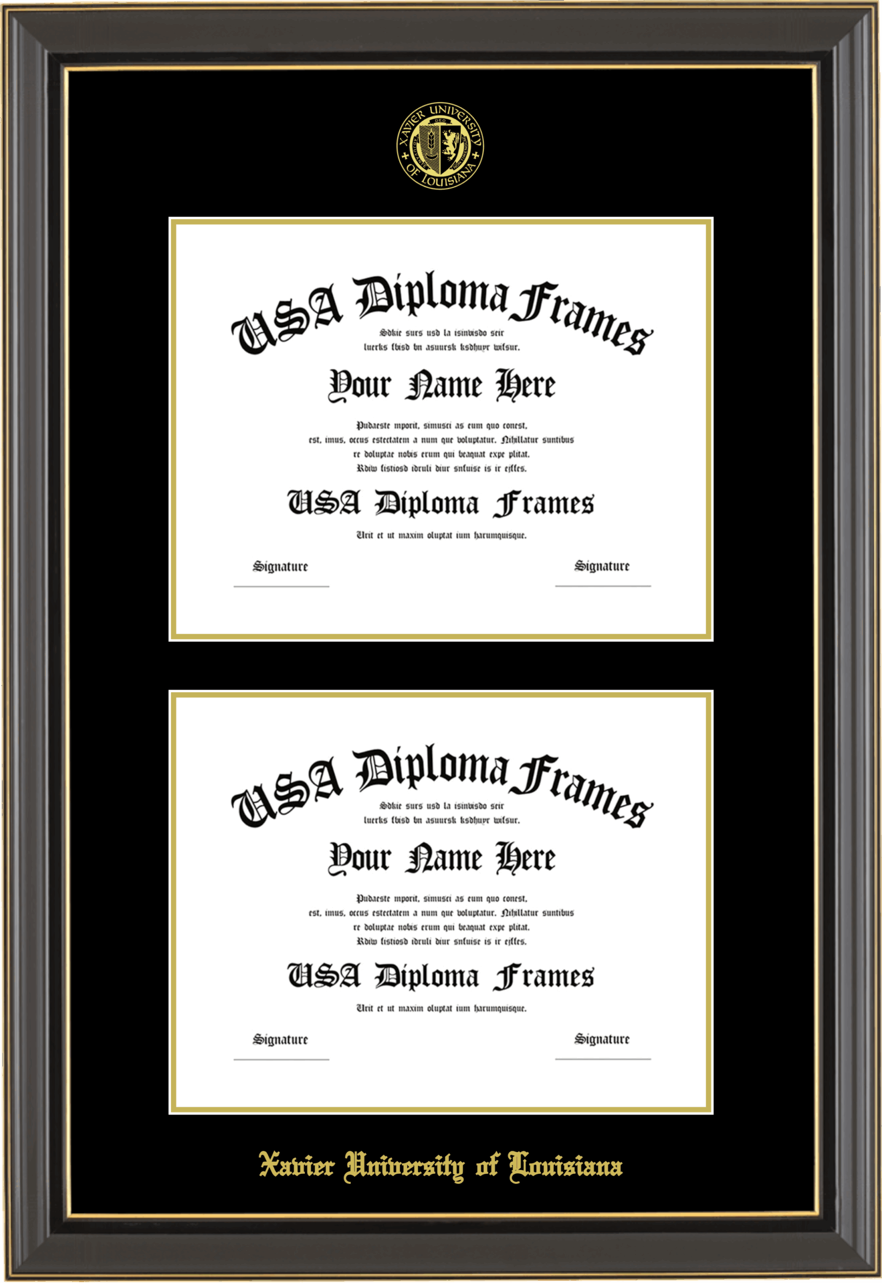 Xavier University of Louisiana Double Diploma Frame – Double Document – Black Gold Trim Glossy – Black and Gold Mat