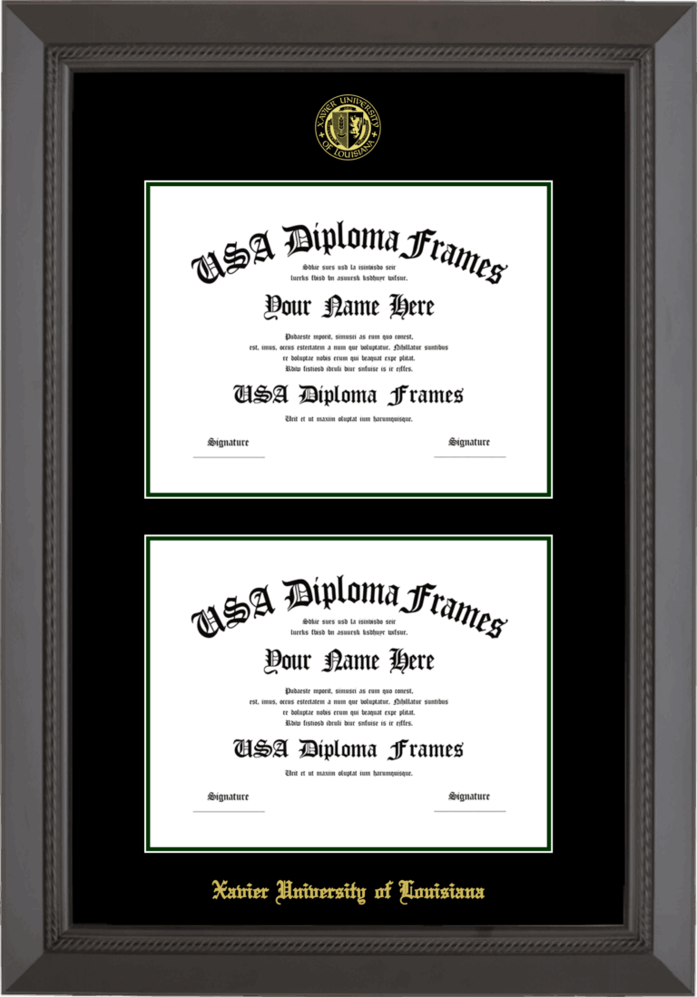Xavier University of Louisiana Double Diploma Frame – Double Document – Black Rope – Black and Winter Green Mat