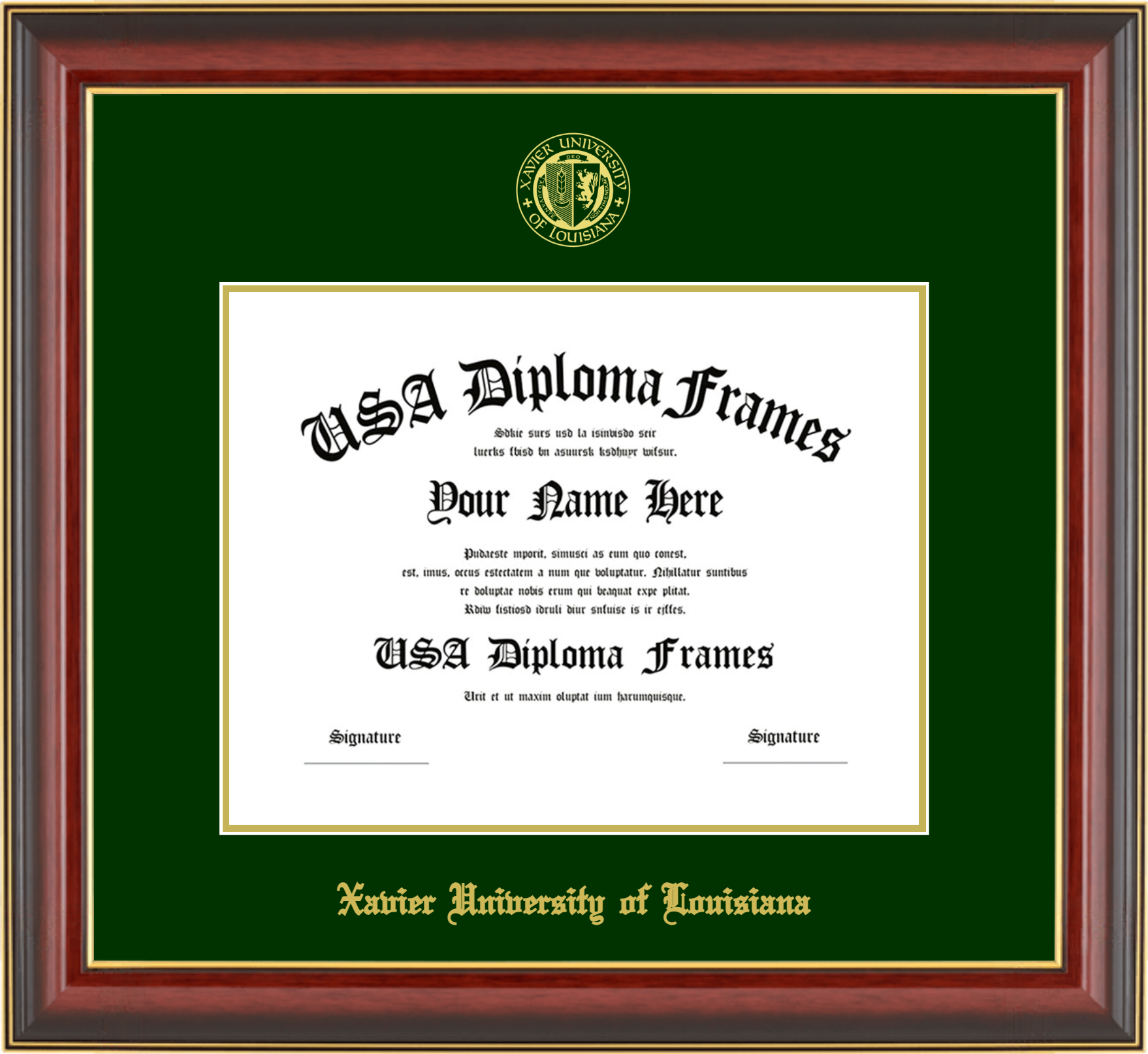 Xavier University of Louisiana – Single Horizontal Document ( Bachelors/Masters ) – Cherry Mahogany Gold Trim Glossy – Winter Green Mat – Gold Accent Mat – With Seal(University Seal Gold) – With Gold Embossing (Xavier University of Louisiana)