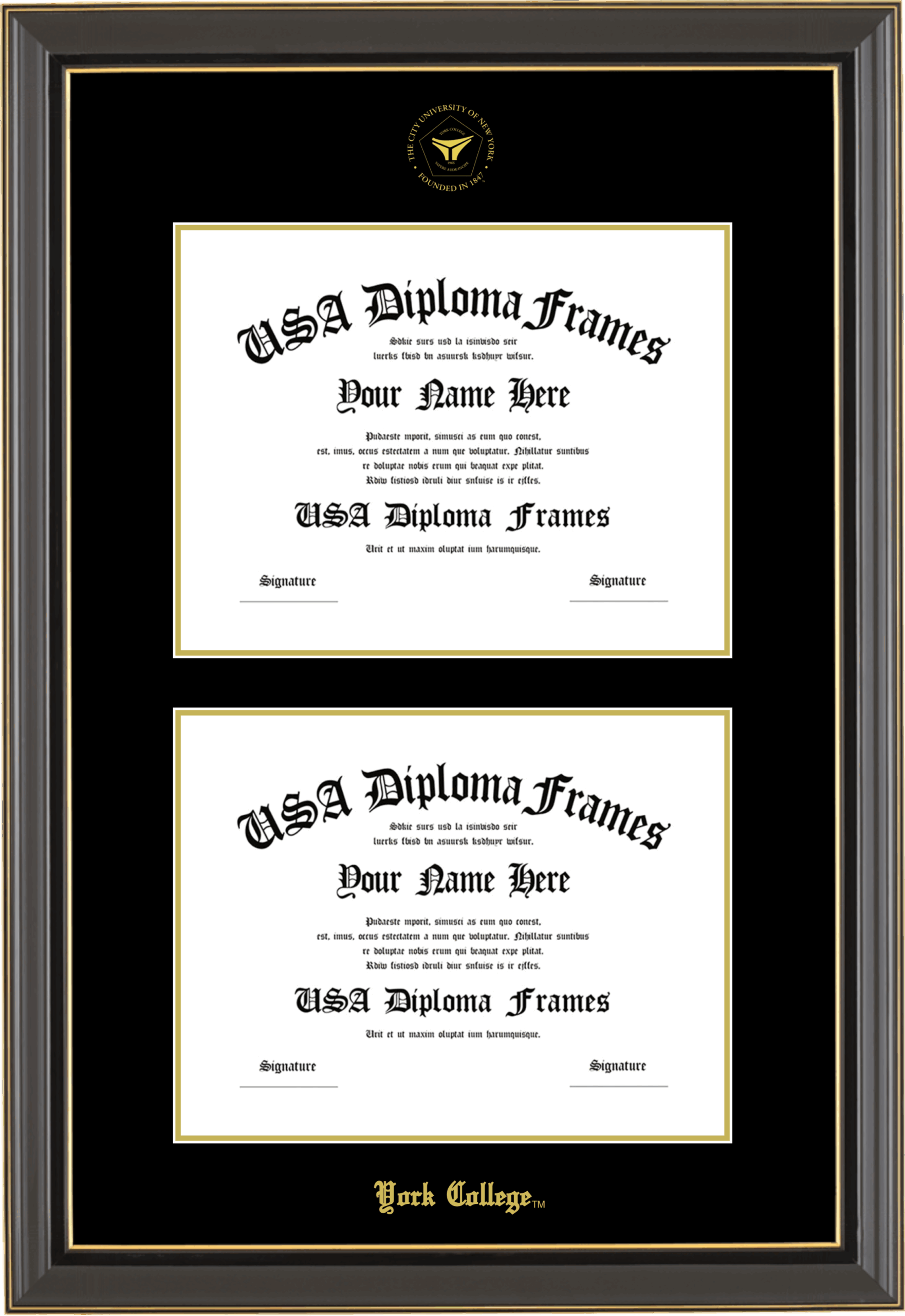 York College Double Diploma Frame – Double Document – Black Gold Trim Glossy – Black and Gold Mat