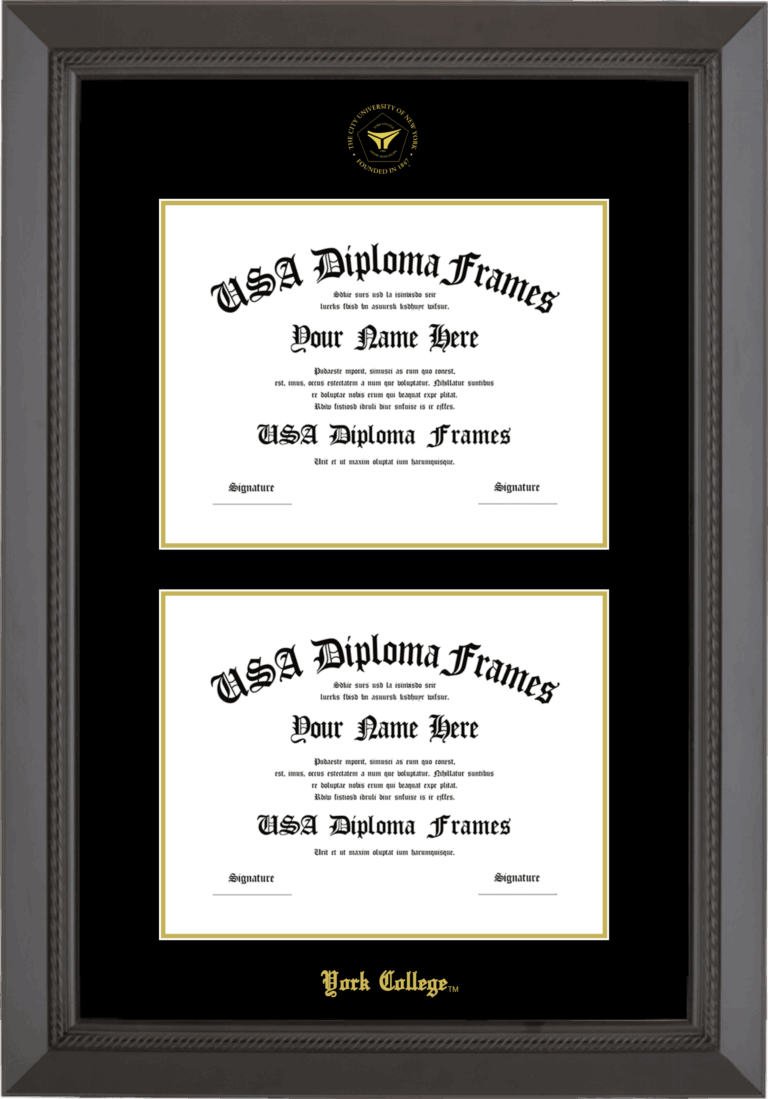York College Double Diploma Frame – Double Document – Black Rope – Black and Gold Mat