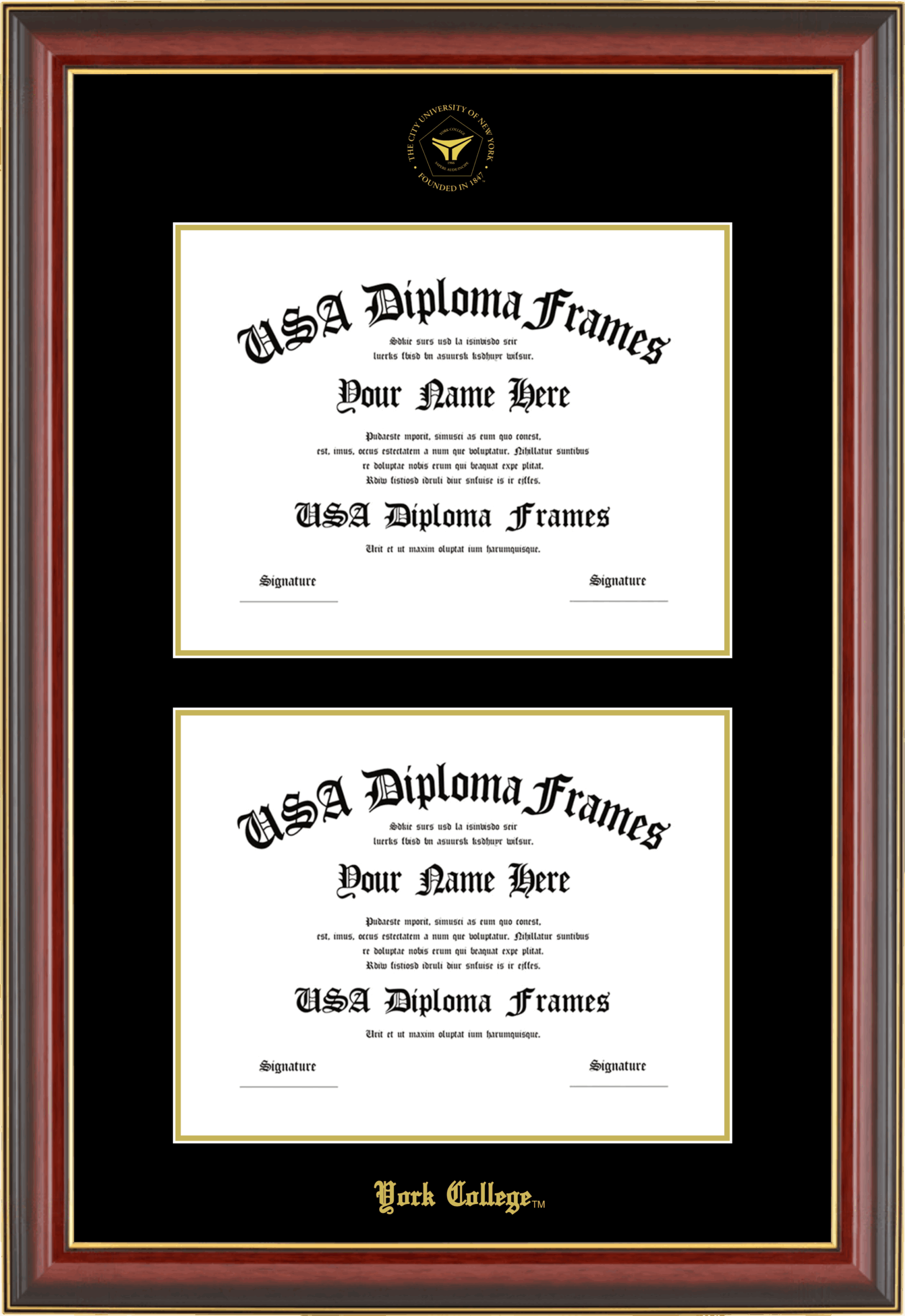 York College Double Diploma Frame – Double Document – Cherry Mahogany Gold Trim Glossy – Black and Gold Mat