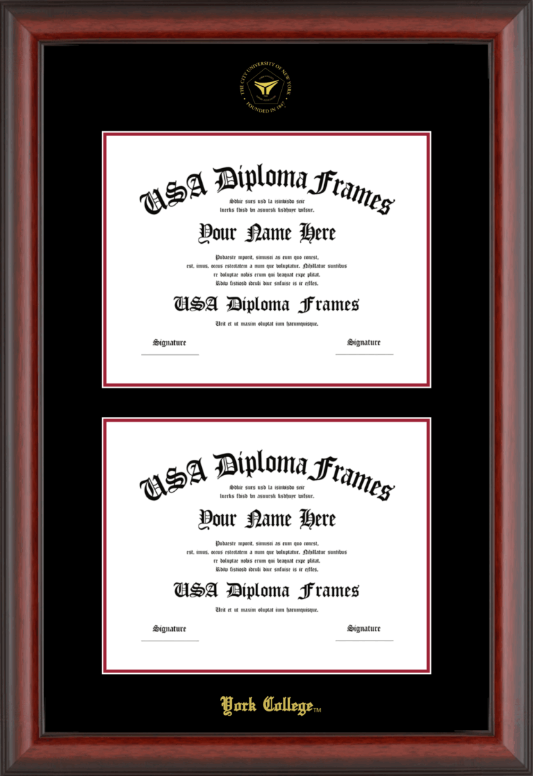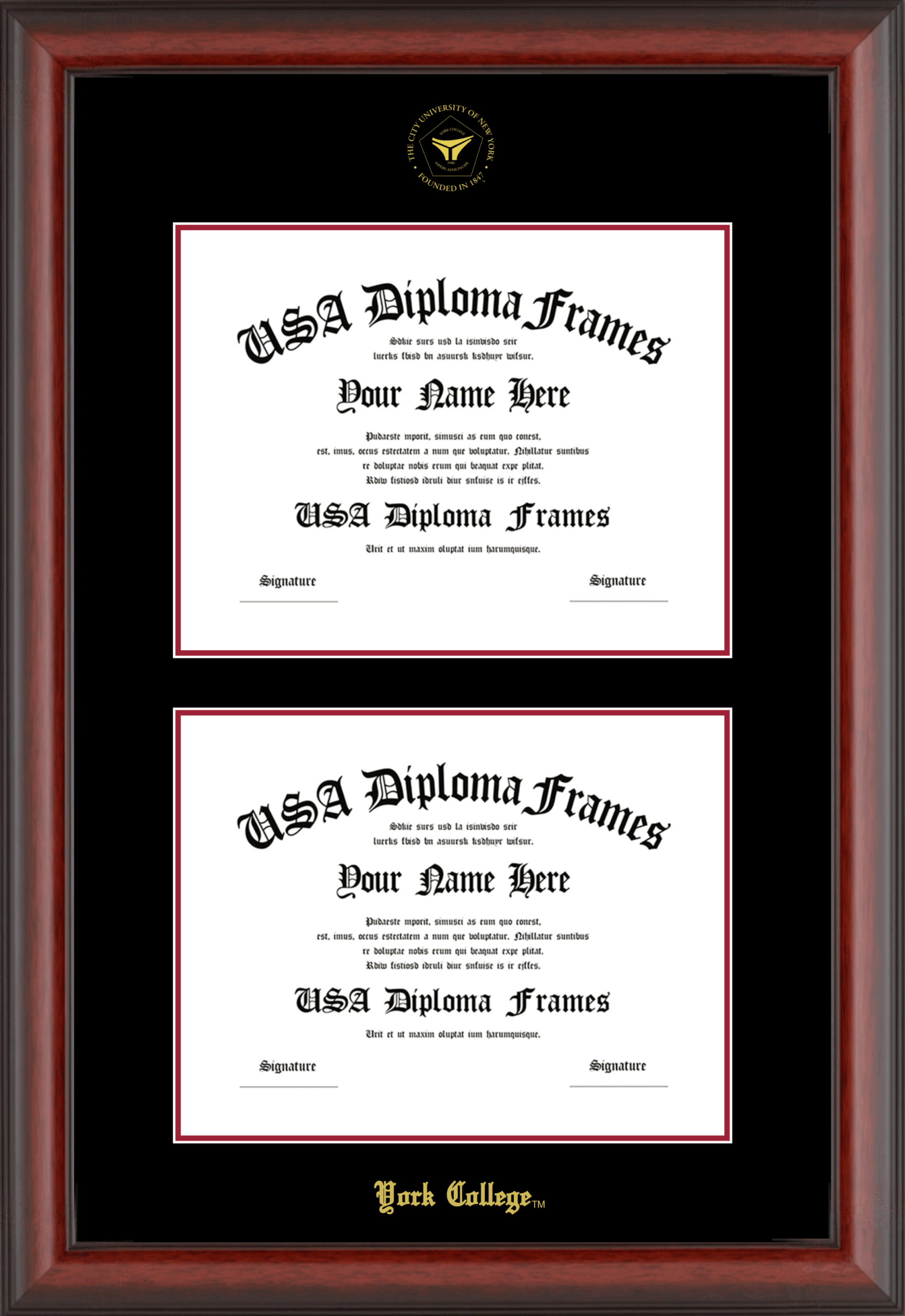 York College Double Diploma Frame – Double Document – Cherry Mahogany Matte – Black and Crimson Mat