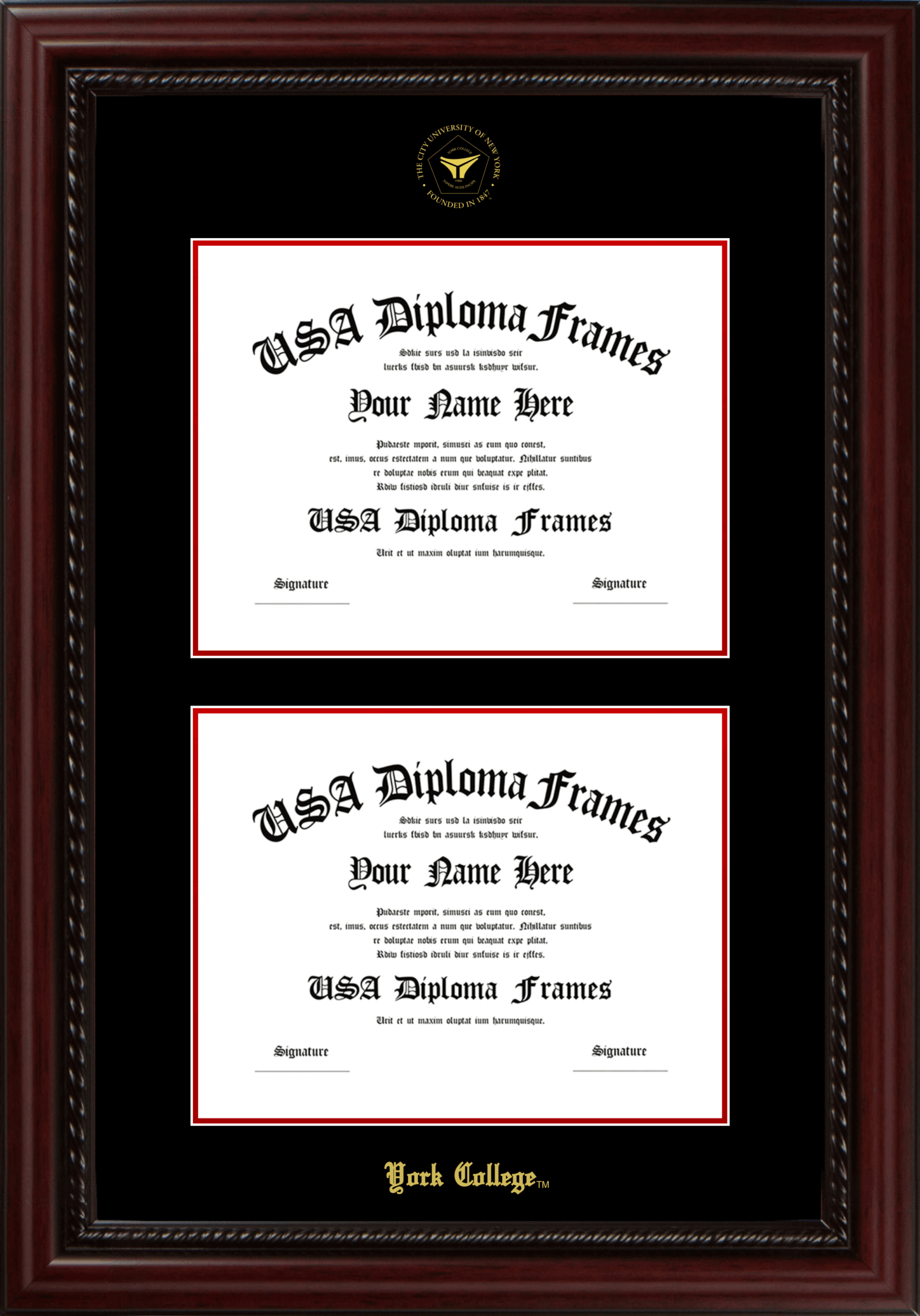 York College Double Diploma Frame – Double Document – Executive Cherry Rope – Black and Red Mat