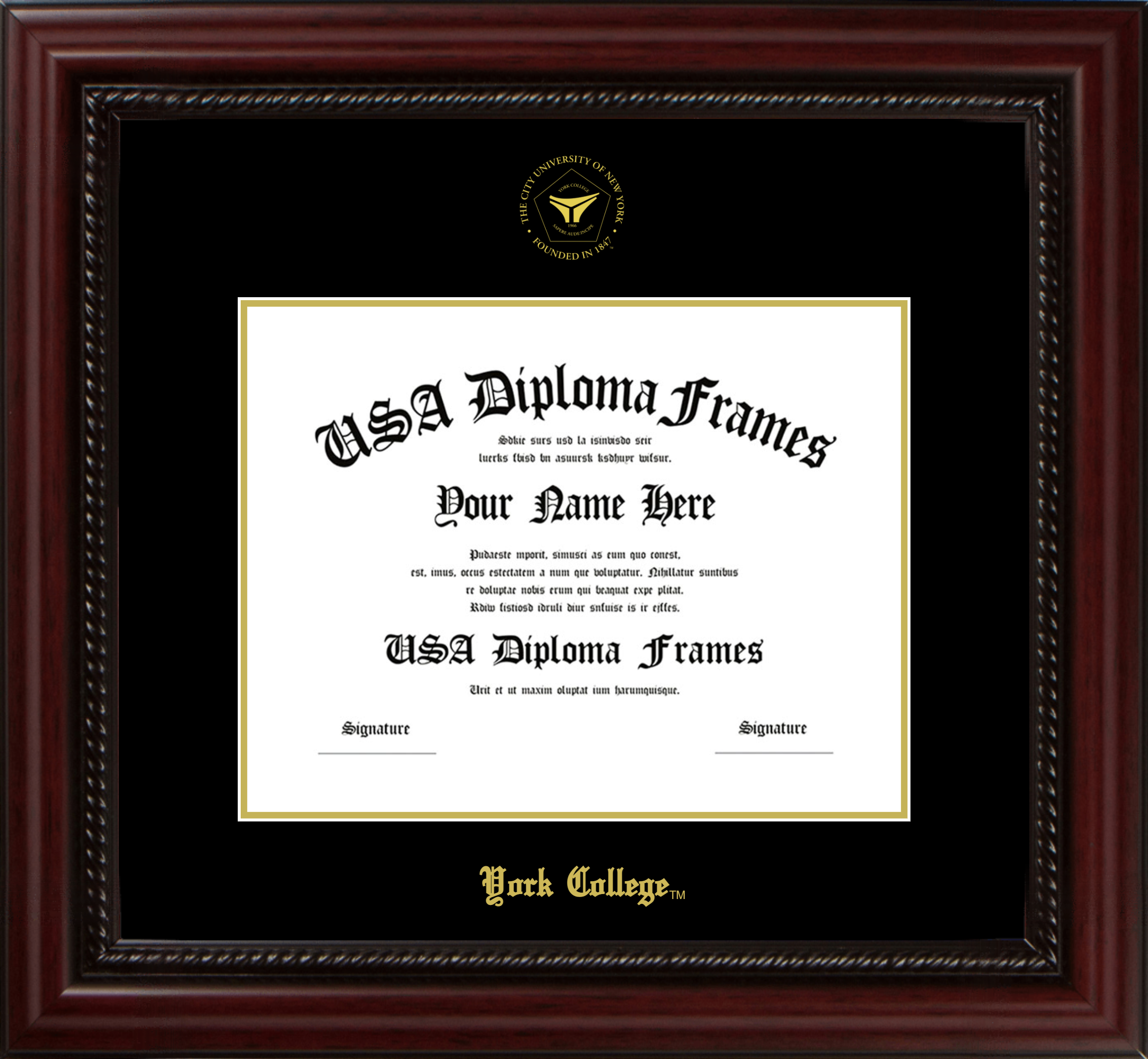 York College Diploma Frame – Executive Cherry Rope – Black and Gold Mat
